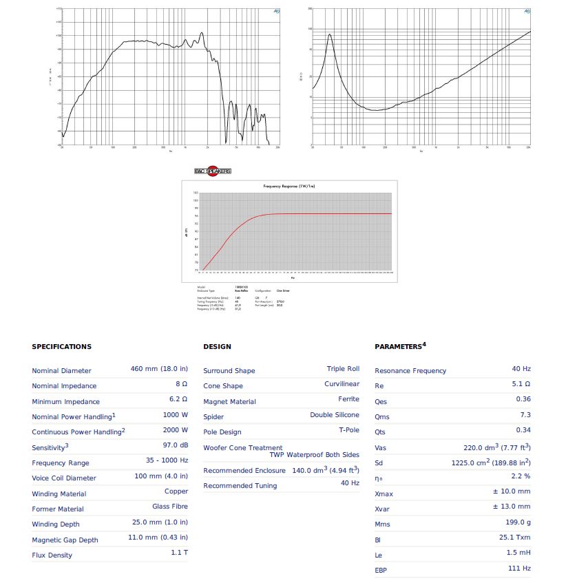 LOA RỜI SUB 5 TẤC B&C Xuất xứ : ITALIA   B&C 18RBX100 mới giữ vững dòng loa siêu trầm ferrite của chúng tôi và có cấu trúc động cơ tối ưu hóa FEA hoàn toàn mới.Cuộn dây bằng đồng cao 25mm, đường kính 4 ”(100mm) được kết hợp với màng nhện silicon kép nhiều lớp, hình nón cong chống nước và vòm ba cuộn. Cấu trúc động cơ chống ăn mòn kết hợp với một vòng giải điều chế bằng nhôm giúp kiểm soát hiệu quả sự gia tăng cảm ứng cũng như biến dạng sóng và xuyên điều chế.Loa siêu trầm này có thể được sử dụng cho nhiều loại thùng khác nhau, bao gồm các thùng loa có lỗ thông hơi nhỏ gọn chỉ 120 lít. Voice coil bằng đồng khổ lớn 4" (100mm) Công Suất Program 2000 W Dải tần: 35-1000 hz Độ nhạy: 97 db Nam châm Ferrite Mạng nhện đôi bằng silicone Voice coil loa B&C SPEAKERS 18TBX100 được thiết kế có độ thông thoáng nhất định giúp bảo vệ loa. Kích thước loa: 460 x 200 mm Đường kính bắt ốc: 440mm Khối lượng loa: 12,3 kg Bản vẽ kỹ thuật: