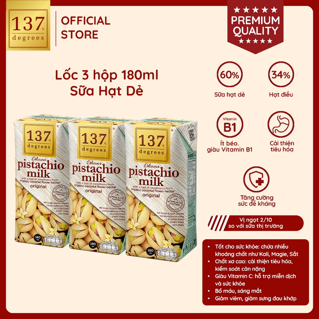 Sữa hạt 137 Degrees là thương hiệu sữa hạt dinh dưỡng số 1 tại Thái Lan, với thành phần hạt tươi nguyên chất đến 99% KHÔNG ĐƯỜNG, KHÔNG CHẤT BẢO QUẢN, KHÔNG PHA TRỘN SỮA BÒ/ SỮA ĐẬU NÀNH, dùng mật hoa...