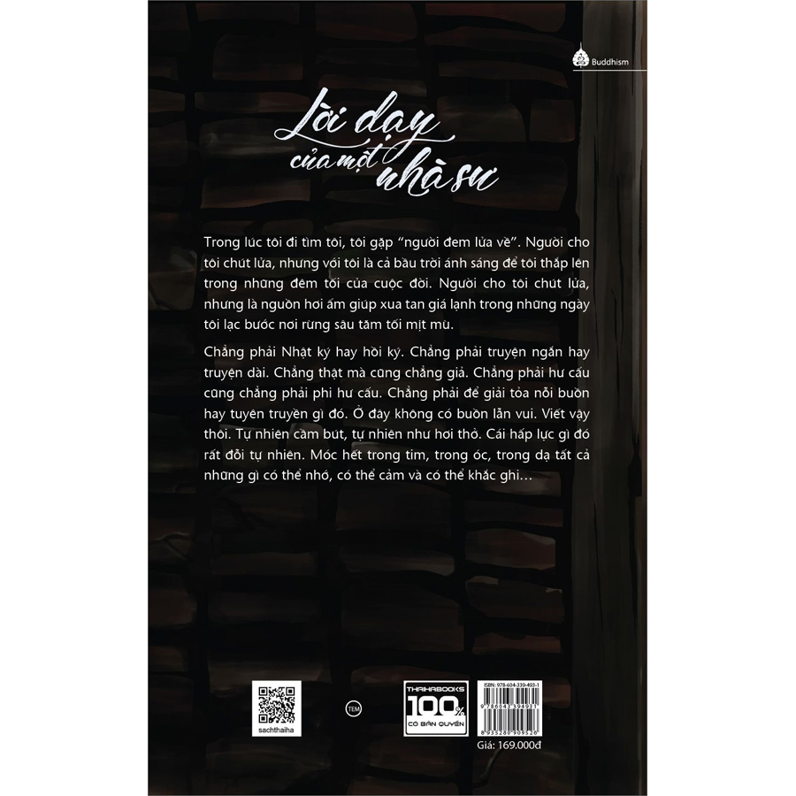 “Lời dạy của một nhà sư”, cuốn sách thể hiện trăn trở của một người trẻ về cuộc sống, cuộc đời, giá trị con người. Từ một người trẻ không có mục đích sống rõ ràng, bị trầm cảm, tác giả đã thay đổi khi gặp được lời dạy của một nhà sư.