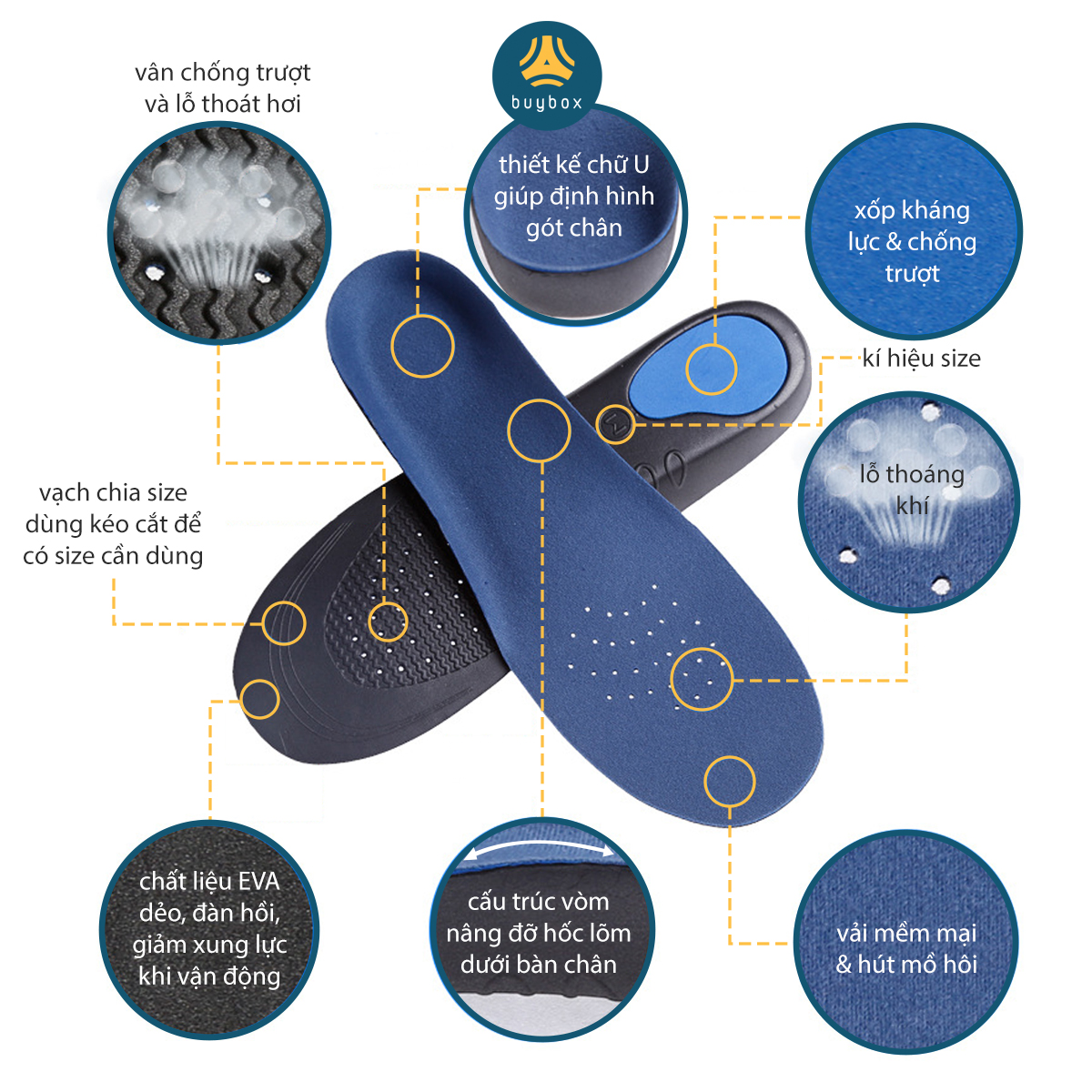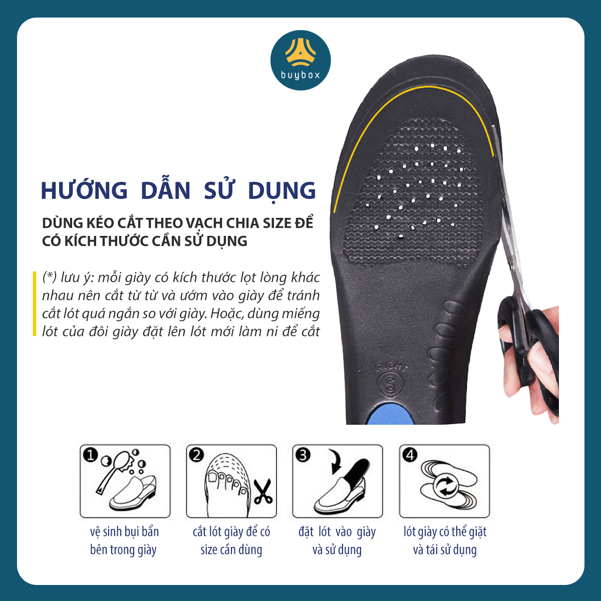 - Bảo quản lót giày ở nơi thoáng mát, tránh ánh nắng trực tiếp và nơi có nhiệt độ cao. DỊCH VỤ buybox buybox luôn nỗ lực hết mình để đem đến sự hài lòng nhất cho khách hàng. Hãy cho chúng tôi biết bằng cách đánh giá cho buybox nhé. Mỗi đánh giá của bạn là một lời động viên để buybox hoàn thiện hơn. NHẮN GỬI KHÁCH HÀNG buybox mong muốn đồng hành trên con đường mang lại sự ÊM ÁI & THOẢI MÁI nhất cho đôi chân Khách Hàng. Luôn mang đến những sản phẩm chất lượng và giá thành tốt nhất, không ngừng tiếp thu để cải tiến nhằm phục vụ tôn chỉ chung - MANG LẠI SỰ THOẢI MÁI NHẤT CHO ĐÔI CHÂN CỦA BẠN!!! "buybox - NGƯỜI BẠN THÂN CỦA ĐÔI CHÂN"