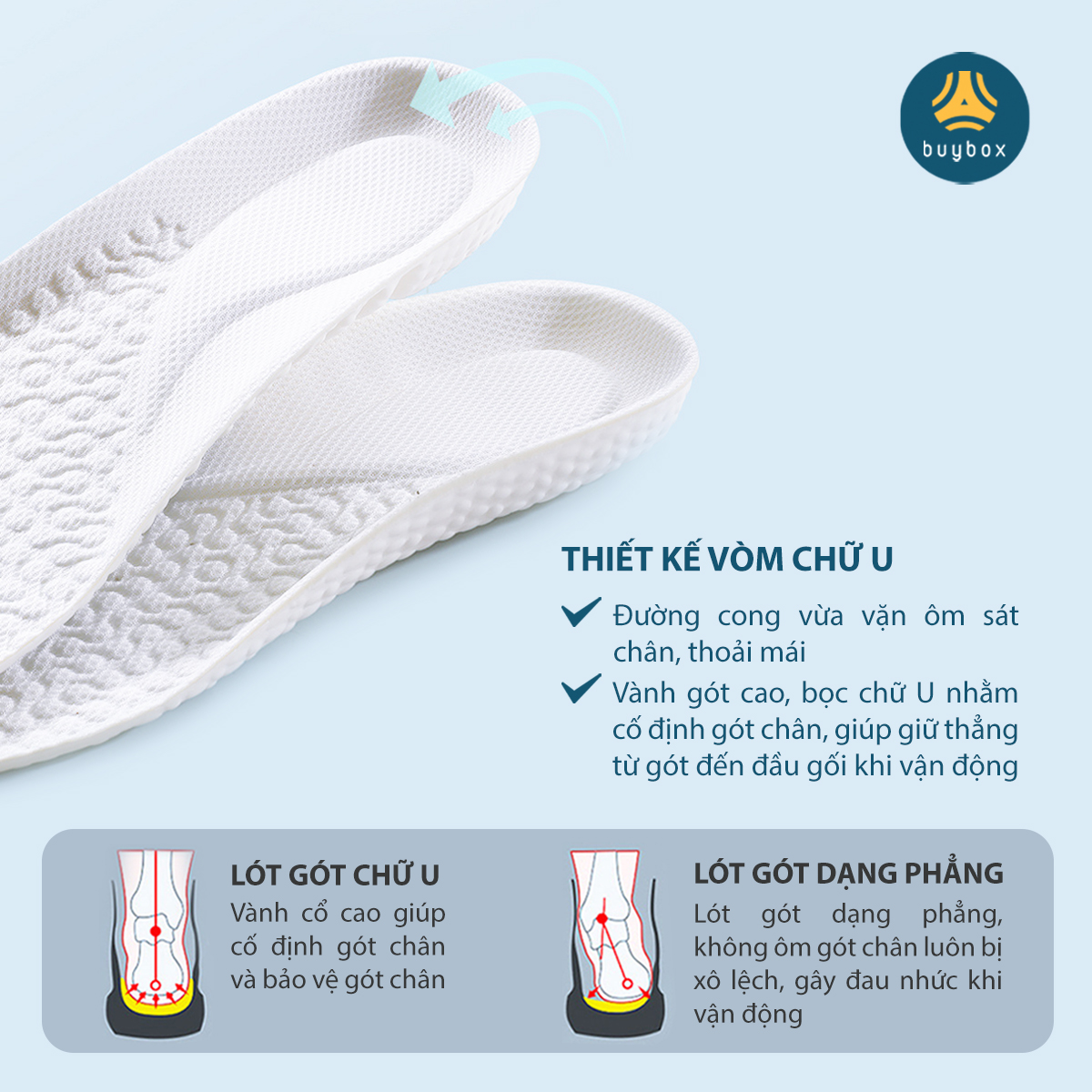 CÔNG DỤNG NỔI BẬC - Lót giày đa năng chống rộng buybox là sự kết hợp giữa lót giày và lót chống trầy gót chân. - Giúp chống rộng