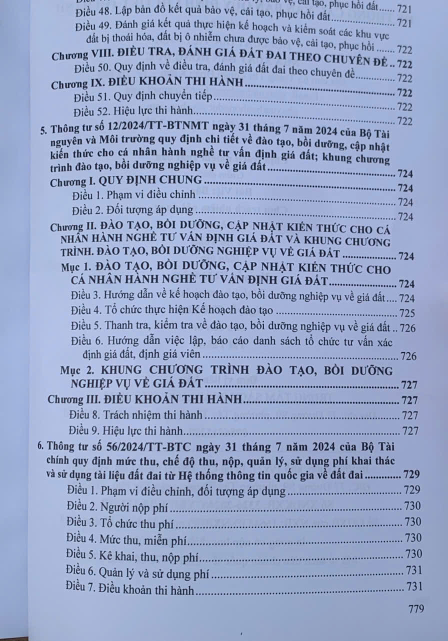Sách- Luật Đất Đai hệ thống các văn bản quy định chi tiết thi hành Tác giả: Quốc Hội Nhà xuất bản: Hồng Đức Khổ sách: 19*27cm Năm phát hành: 10.2024 Nhà phát hành: Công ty TNHH Sách Luật Việt Nam Giá bìa: 775.000 đ Số trang: 780 trang Hình thức bìa: Bìa mềm Ngày 18 tháng 01 năm 2024, Quốc hội nước Cộng hòa xã hội chủ nghĩa Việt Nam khóa XV, kỳ họp bất thường lần thứ năm đã chính thức thông qua Luật Đất đai (sau đây gọi tắt là Luật Đất đai 2024) với nhiều điểm mới nhằm thể chế hóa toàn diện các chủ trương, chính sách của Đảng và Nhà nước. Nhằm sớm đưa Luật đất đai 2024 Chính phủ và các Bộ ngành đã ban hành nhiều văn bản quy định chi tiết thi hành như: Nghị định số 123/2024/NĐ-CP của Chính phủ: Quy định về xử phạt vi phạm hành chính trong lĩnh vực đất đai; Nghị định số 104/2024/NĐ-CP ngày 31 tháng 7 năm 2024 của Chính phủ quy định về Quỹ phát triển đất; Nghị định số 103/2024/NĐ-CP ngày 30 tháng 7 năm 2024 của Chính phủ Quy định về tiền sử dụng đất, tiền thuê đất; Nghị định số 102/2024/NĐ-CP ngày 30 tháng 7 năm 2024 của Chính phủ Quy định chi tiết thi hành một số điều của Luật Đất đai 2024; Nghị định số 101/2024/NĐ-CP ngày 29 tháng 7 năm 2024 của Chính phủ Quy định về điều tra cơ bản đất đai; đăng ký, cấp giấy chứng nhận quyền sử dụng đất, quyền sở hữu tài sản gắn liền với đất và hệ thống thông tin đất đai; Nghị định số 88/2024/NĐ-CP ngày 15 tháng 7 năm 2024 của Chính phủ Quy định về bồi thường, hỗ trợ, tái định cư khi Nhà nước thu hồi đất; Nghị định số 71/2024/NĐ-CP của Chính phủ: Quy định về giá đất: Thông tư số 08/2024/TT-BTNMT ngày 31 tháng 7 năm 2024 của Bộ Tài nguyên và Môi trường Quy định về thống kê, kiểm kê đất đai và lập bản đồ hiện trạng sử dụng đất; Thông tư số 09/2024/TT-BTNMT ngày 31 tháng 7 năm 2024 của Bộ Tài nguyên và Môi trường Quy định về nội dung, cấu trúc, kiểu thông tin cơ sở dữ liệu quốc gia về đất đai và yêu cầu kỹ thuật đối với phần mềm ứng dụng của Hệ thống thông tin quốc gia về đất đai; Thông tư số 10/2024/TT-BTNMT ngày 31 tháng 7 năm 2024 của Bộ Tài nguyên và Môi trường Quy định về hồ sơ địa chính, Giấy chứng nhận quyền sử dụng đất, quyền sở hữu tài sản gắn liền với đất; Thông tư số 11/2024/TT-BTNMT ngày 31 tháng 7 năm 2024 của Bộ Tài nguyên và Môi trường Quy định kỹ thuật điều tra, đánh giá đất đai; kỹ thuật bảo vệ, cải tạo, phục hồi đất… Để giúp quý độc giả có tài liệu tham khảo áp dụng trong công việc, Nhà xuất bản Hồng Đức xin giới thiệu cuốn sách: LUẬT ĐẤT ĐAI HỆ THỐNG CÁC VĂN BẢN QUY ĐỊNH CHI TIẾT THI HÀNH Nội dung cuốn sách bao gồm những phần như sau: Phần thứ nhất. LUẬT ĐẤT ĐAI NĂM 2024. Phần thứ hai. HỆ THỐNG CÁC NGHỊ ĐỊNH QUY ĐỊNH CHI TIẾT THI HÀNH LUẬT ĐẤT ĐAI Phần thứ ba. HỆ THỐNG CÁC THÔNG TƯ QUY ĐỊNH CHI TIẾT THI HÀNH LUẬT ĐẤT ĐAI.