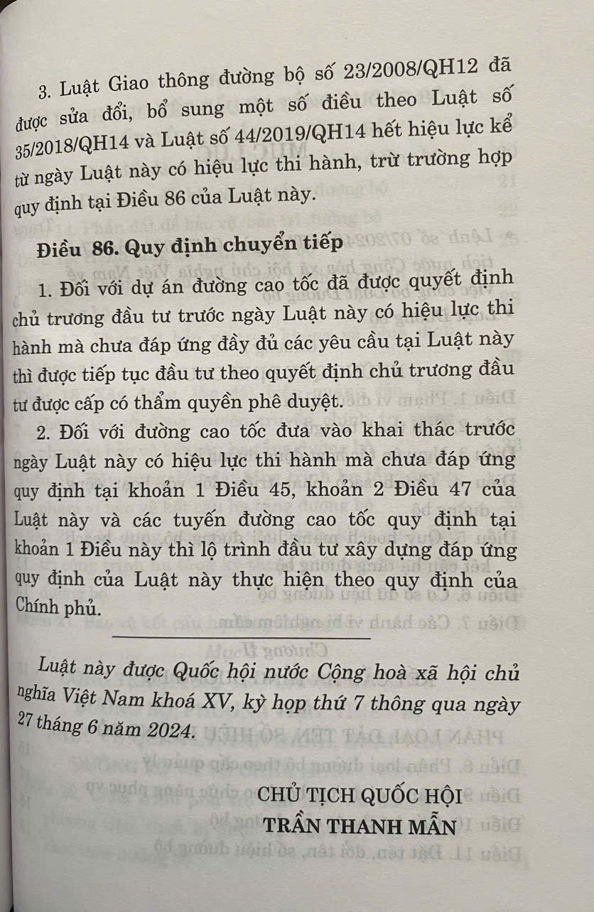 Mua tại TiktokLuật Đường Bộ số 35/2024/QH15 được Quốc hội nước Cộng hòa xã hội chủ nghĩa Việt Nam khóa XV, kỳ họp thứ 7 thông qua ngày 27 tháng 6 năm 2024 . Luật Đường bộ năm 2024 gồm 6 chương và 86 điều quy định về quy hoạch, đầu tư, xây dựng, quản lý, vận hành, khai thác, bảo trì, bảo vệ kết cấu hạ tầng đường bộ; tổ chức vận tải đường bộ và quản lý nhà nước về hoạt động đường bộ. Luật có hiệu lực áp dụng từ ngày 01 -01-2025.