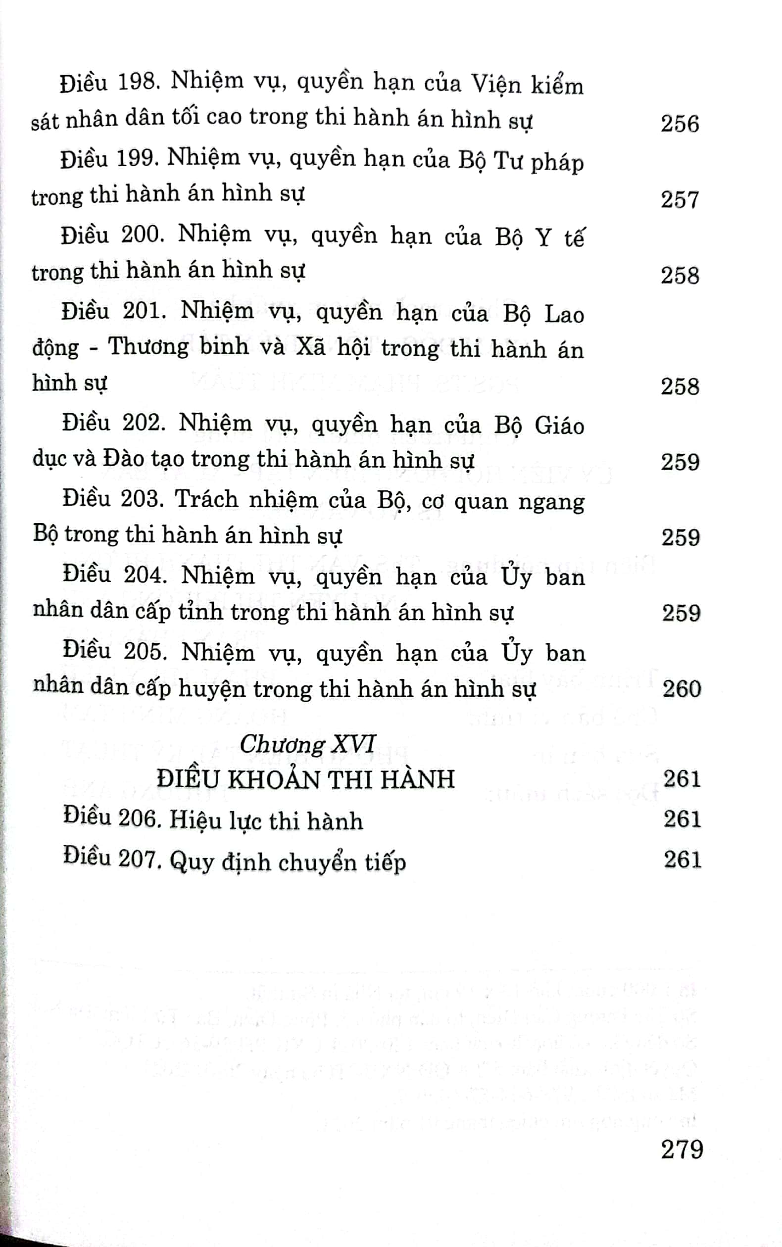 Luật Thi hành án hình sự (hiện hành) gồm 16 chương và 207 điều, quy định nguyên tắc, trình tự, thủ tục, tổ chức, nhiệm vụ, quyền hạn của cơ quan, người có thẩm quyền trong thi hành bản án, quyết định về hình phạt tù, tử hình, cảnh cáo, cải tạo không giam giữ, cấm cư trú, quản chế, trục xuất, tước một số quyền công dân, cấm đảm nhiệm chức vụ, cấm hành nghề hoặc làm công việc nhất định, án treo, tha tù trước thời hạn có điều kiện, hình phạt đình chỉ hoạt động có thời hạn, đình chỉ hoạt động vĩnh viễn, cấm kinh doanh, cấm hoạt động trong lĩnh vực nhất định, cấm huy động vốn, biện pháp tư pháp; quyền, nghĩa vụ của người, pháp nhân thương mại chấp hành án hình sự, biện pháp tư pháp; trách nhiệm của cơ quan, tổ chức, cá nhân có liên quan trong thi hành án hình sự, biện pháp tư pháp. Luật được Quốc hội nước Cộng hòa xã hội chủ nghĩa Việt Nam khóa XIV, kỳ họp thứ 7 thông qua ngày 14/6/2019, có hiệu lực thi hành 01/01/2020.