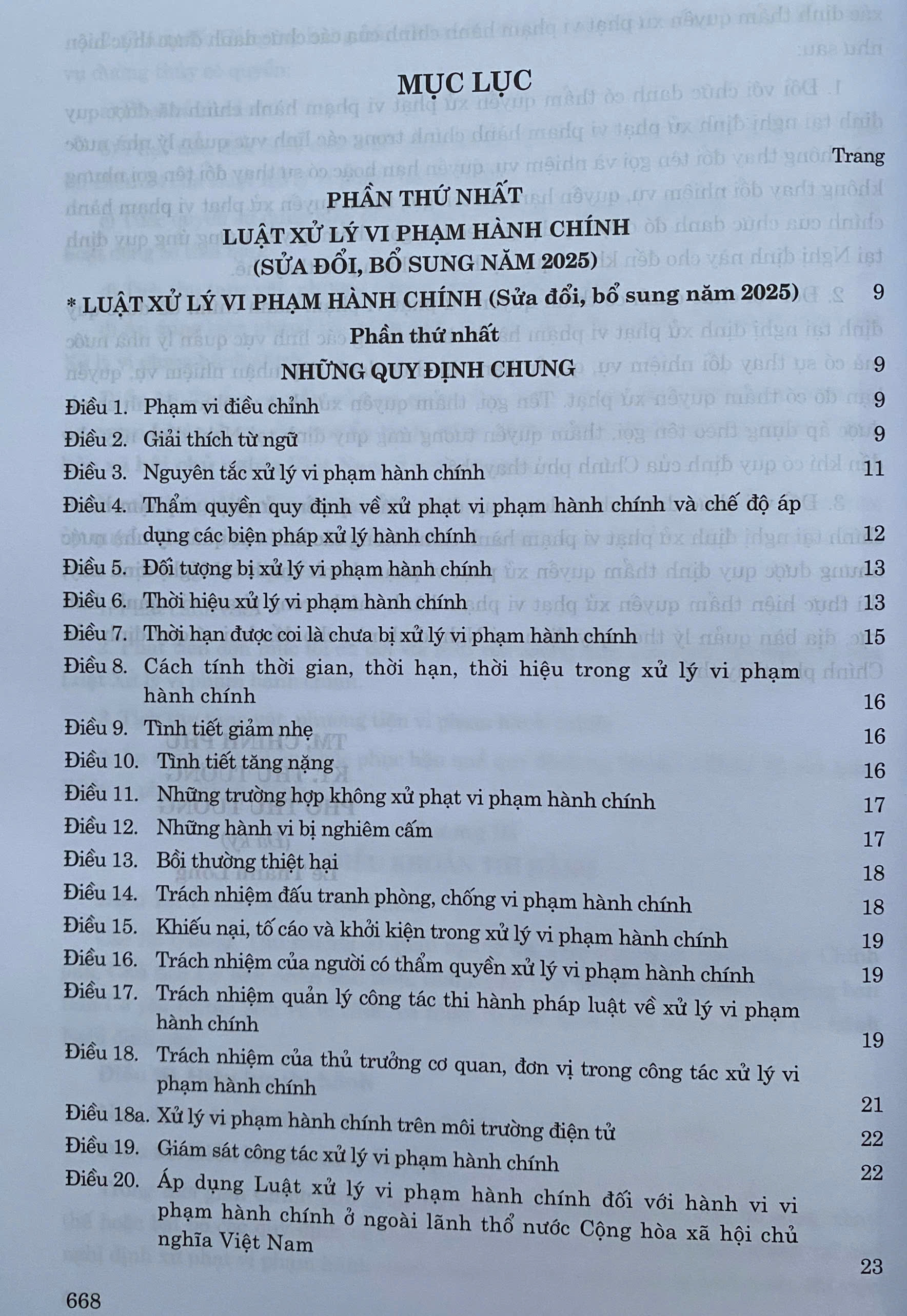Luật xử lý vi phạm hành chính (Luật số 15/2012/QH13) được Quốc hội nước Cộng hòa xã hội chủ nghĩa Việt Nam khóa XIII thông qua ngày 20 tháng 6 năm2012 và có hiệu lực từ ngày 01 tháng 7 năm 2013. Để bảo đảm phù hợp với tình hình thực tiễn, Luật Xử lý vi phạm hành chính đã được sửa đổi, bổ sung nhiều lần. Ngày 25 tháng 6 năm 2025, tại Kỳ họp thứ 9, Quốc hội nước Cộng hòa xã hội chủ nghĩa Việt Nam khóa XV đã thông qua Luật sửa đối, bố sung một số điều của Luật Xử lý vi phạm hành chính. Việc thay đối quy định của Luật Xử lý vi phạm hành chính đã dẫn đến quá trình thay đổi rất nhiều các nghị định có liên quan. Với mục tiêu kịp thời cập nhật, phổ biến những thay đổi và dễ dàng tra cứu, thuận tiện sử dụng cho bạn đọc.
