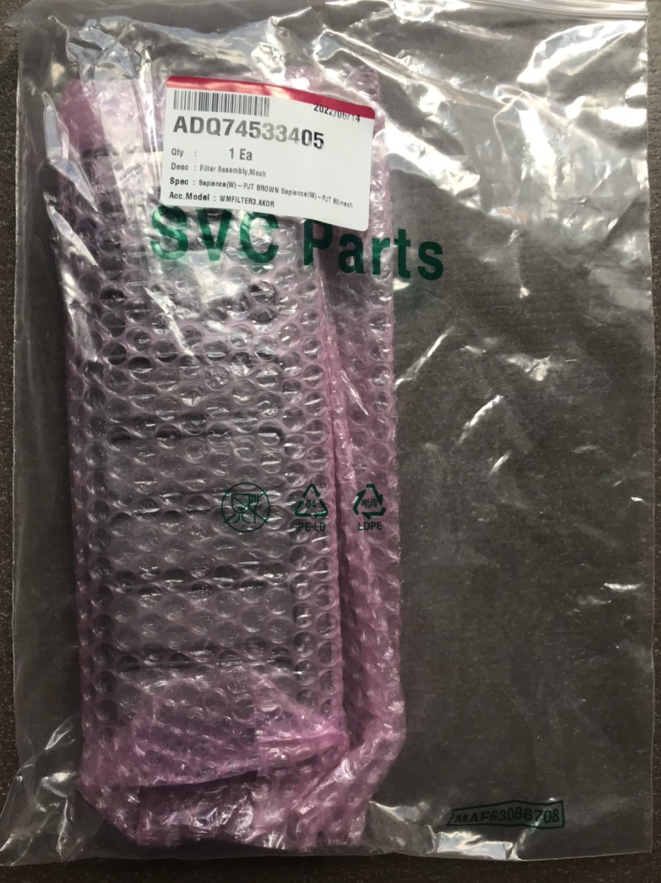Lưới lọc sợi vải máy giặt dung chung cho các model máy giặt LG 14kg, 16kg, 18kg, 19kg và 20kg + Hàng mới 100% - Hàng chính hãng + Kích thước: 26cm x 9.5cm x