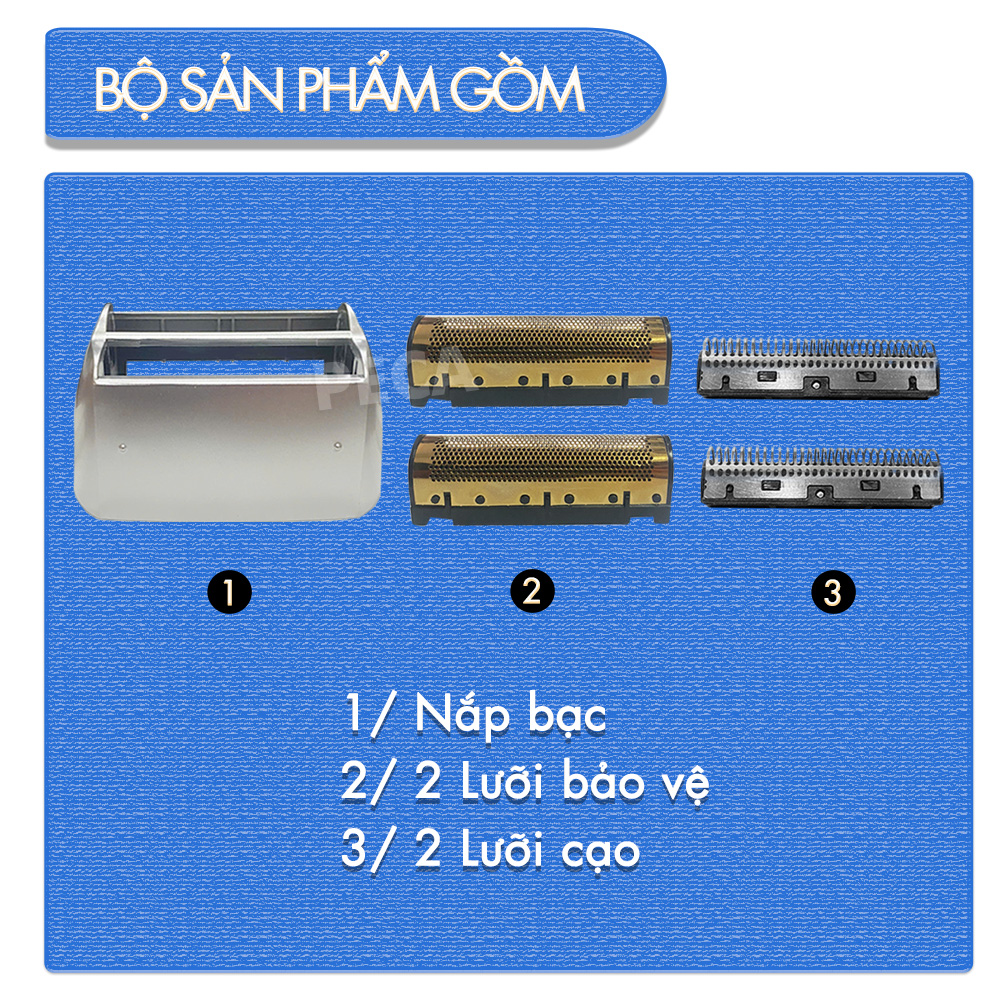 • Canh ngay khớp gắn lần lượt lưới và lưỡi cắt vào ngay vị trí như lúc mở ban đầu, sau đó lắp đầu bảo vệ vào lại thân máy là hoàn thành. Bộ sản phẩm bao gồm: 1 nắp bạc bảo vệ, 2 lưới, 2 lưỡi cắt