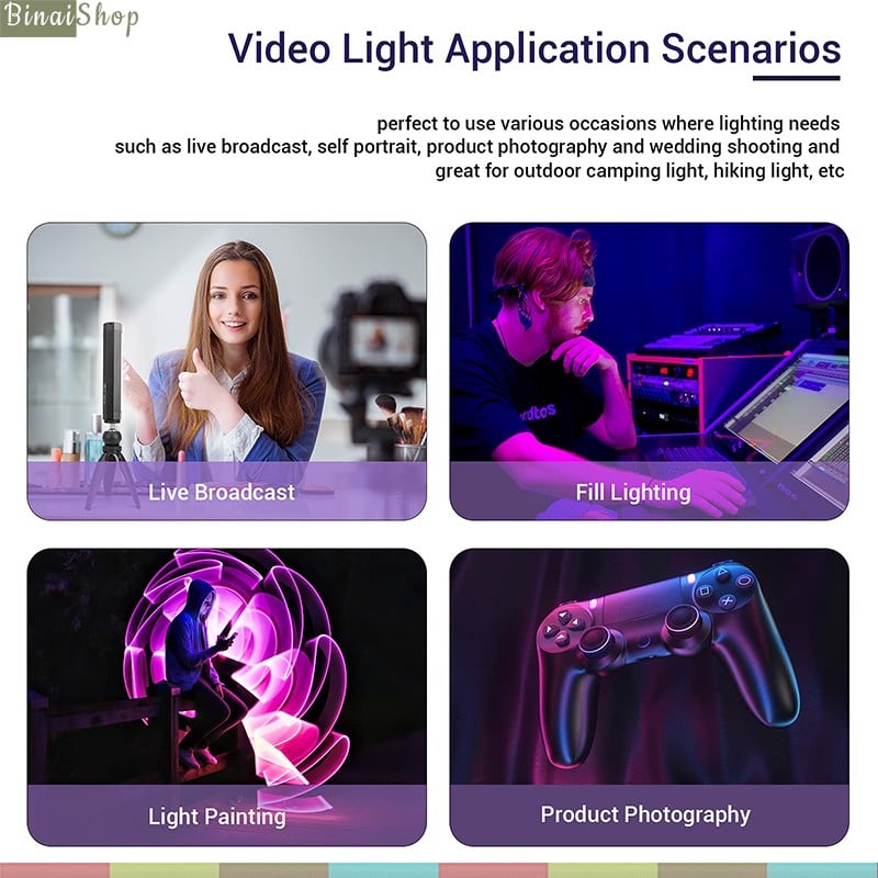 - Sách hướng dẫn THÔNG SỐ KỸ THUẬT Body Materal Aluminum alloy Waterproof Level IP67 RGB Color Gamut 0-360° full color by APP Brightness 500lm(Max) Color Temperature Range 3000K-6000K Color Rendering Ra>95+ Dimming Range 1-100% Fixed Interface universal 1/4″ screws Product Dimension 201.5mm37.5mm37.5mm Rated Power 6W(max) Built-in Lithium Battery DC 3.7V 4000mAh(power bank function) Charging Time About 3 hours(use 2A adapter) Input DC 5V/2.1A Output DC 5V/2.4A Input Port Type-C Battery Life 100% brightness continuous for about 2.5 hours Keyword: , , , , .