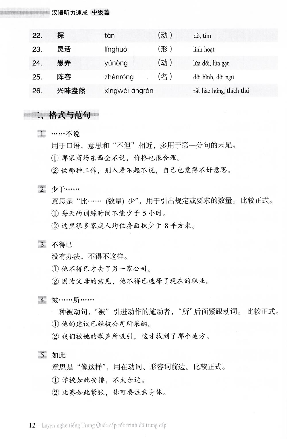 Cuốn sách này thích hợp cho người học đã có khả năng nghe nói trung cấp, nắm được các nội dung ngữ pháp cơ bản trong tiếng Trung Quốc và có vốn từ vựng trên 2500 từ. Giáo trình gồm 14 bài, chủ yếu giới thiệu từ vựng, ngữ pháp và những mẫu văn nói, văn viết cơ bản thường được sử dụng trong tiếng Trung Quốc với trình độ tương đương B và C, cùng các tình huống giao tiếp tương đối phức tạp có nội dung liên quan đến các lĩnh vực trong cuộc sống như sinh hoạt, học tập, công việc, văn hoá, xã hội....