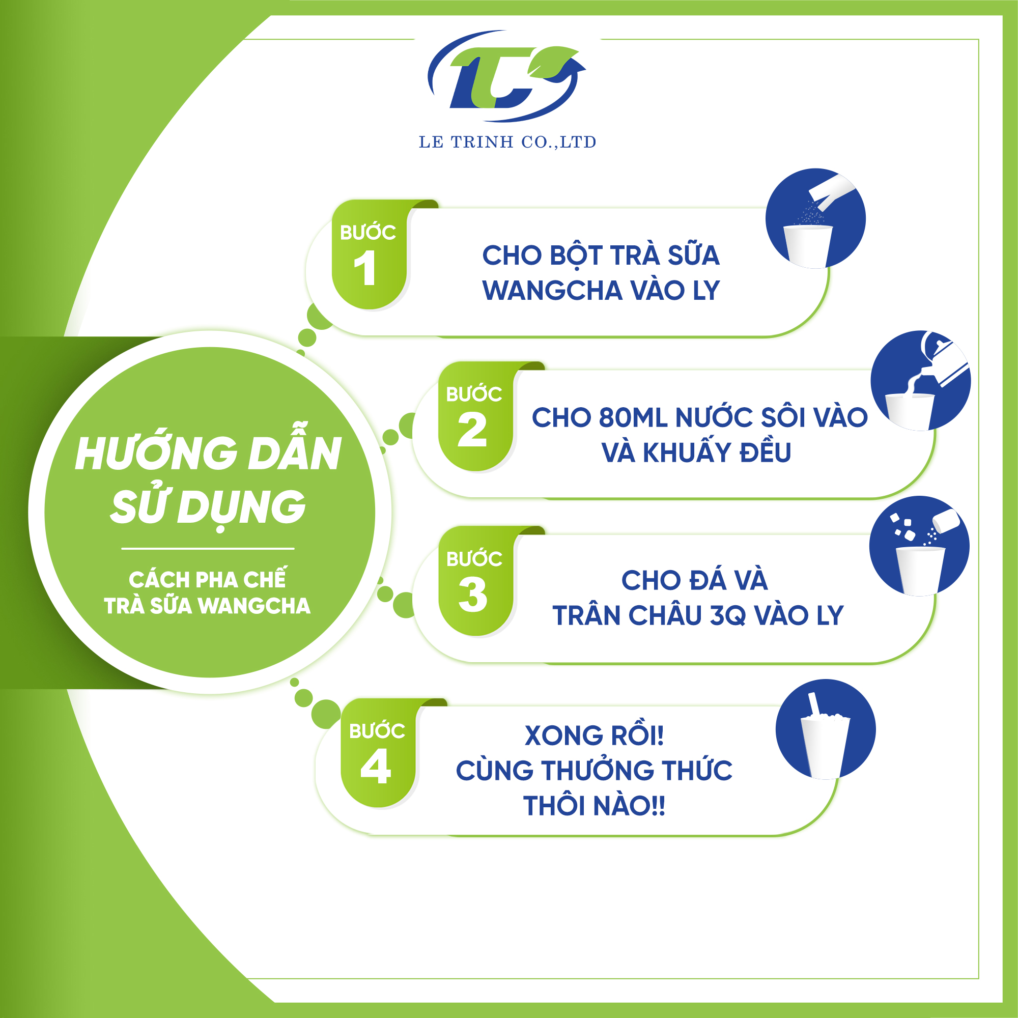 Mua tại TiktokThương hiệu Lê Trình Xuất xứ Việt Nam HSD 1 năm kể từ ngày sản xuất Là sản phẩm trà sữa tiện lợi gồm bột hòa tan trà sữa matcha và có thạch 3Q ngọc trai đi kèm, thơm ngon dễ sử dụng. Các sản phẩm được chế biên với công nghệ hiện đại và quy trình sản xuất nghiêm ngặt theo tiêu chuẩn quốc tế, tiêu chuẩn an toàn vệ sinh thực phẩm và chứng nhận tiêu chuẩn HACCP, ISO 22000 và ISO 9001. -Là một loại thức uống vô cùng tiện lợi, với cách pha nhanh gọn và dễ dàng phù hợp cho tất cả mọi người đặc biệt là các đối tượng đang đi học, đi làm tại văn phòng. Các loại trà sữa Wangcha hiện nay
