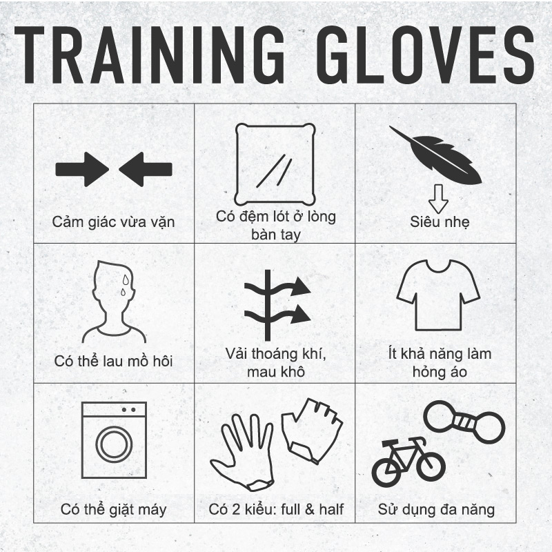 Thông tin cơ bản: - Loại sản phẩm: Găng tay nửa ngón. - Chức năng: Chống trượt, chống mồ hôi. - Kích thích lòng bàn tay: 9-11 cm. - Chất liệu: sợi mịn, bọt biển