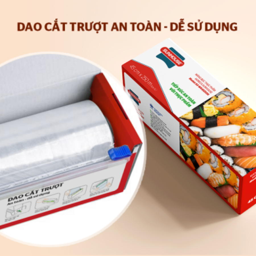 Màng bọc thực phẩm Sunhouse được làm từ chất liệu nhựa PE an toàn, không chứa hóa chất độc hại nên bạn có thể yên tâm khi dùng tiếp xúc trực tiếp với thực phẩm