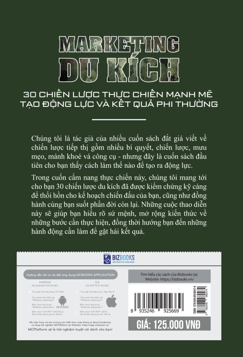 - Cuốn sách tập hợp chiến lược thực chiến mạnh mẽ để giảm chi phí, tăng hiệu quả và tạo ra lợi nhuận tối ưu. Phương thức marketing khác biệt Marketing du kích là một phương thức marketing khác biệt được sử dụng đề thực hiện các hoạt động xúc tiến thương mại với ngân sách hạn chế. Marketing du kích có mục đích chủ yếu là gây chú ý cho khách hàng, làm họ bất ngờ, từ đó giành về lợi ích trong doanh thu và thương hiệu. Mục tiêu lớn nhất của marketing chính là tạo ra lợi nhuận. Tiếp thị du kích là một cách thức giúp các chủ doanh nghiệp có thể chỉ phải tiêu tốn ít tiền hơn, song nhận lại nhiều hơn, đạt được lợi nhuận đáng kể. Trong marketing, kiến thức không thôi là chưa đủ để bạn hoàn thành nhiệm vụ. Biết về nó là một điều tốt chỉ khi bạn áp dụng được kiến thức vào hành động, còn nếu không thì cũng vô dụng mà thôi. Kiến thức cộng với hành động, đó là thứ giúp bạn đạt được kết quả thậm chí còn vượt trên cả mục tiêu của mình. Làm sao để có một chiến lược tiếp thị du kích hiệu quả? Tiếp thị đã thay đổi rất nhiều trong những năm qua. Điều đầu tiên bạn cần một ý tưởng tốt nếu bạn muốn thực hiện bất kỳ loại tiếp thị nào. Bạn cũng sẽ cần một chiến lược tiếp thị vững vàng và không cần phải quá phức tạp. Dù những gì bạn cung cấp có phức tạp đến đâu, bạn phải bắt đầu với một chiến lược tiếp thị thật đơn giản. Một chiến lược tiếp thị du kích ngắn gọn khiến bạn tập trung vào những khách hàng mục tiêu thông qua tiếp thị. Luôn bắt đầu với yếu tố con người và sau đó mới đến phần sản phẩm cung cấp. Một chiến lược như vậy sẽ tập trung toàn bộ vào kết quả bạn muốn, cách bạn lên kế hoạch để đạt được những kết quả đó, cùng những hành động cụ thể mà bạn muốn khách hàng mục tiêu sẽ làm. Nó cho bạn định hướng để đánh giá những nỗ lực tiếp thị cho 10 hay 20 năm tới. Chiến lược phải được viết ra và nó không nên có những dòng tiêu đề, những dòng giải thích hay nội dung quảng cáo. Chiến lược phải tránh sa đà vào những bài viết quảng cáo cụ thể bởi nó cần chặt chẽ nhưng vẫn phải đủ linh hoạt. Những từ ngữ hay cụm từ quá cụ thể sẽ khiến bạn bị chùn bước. Một chiến lược tiếp thị du kích nên được phát triển như một định hướng chứ không phải là một mệnh lệnh. Một số bước cần thực hiện trong chiến dịch marketing du kích: