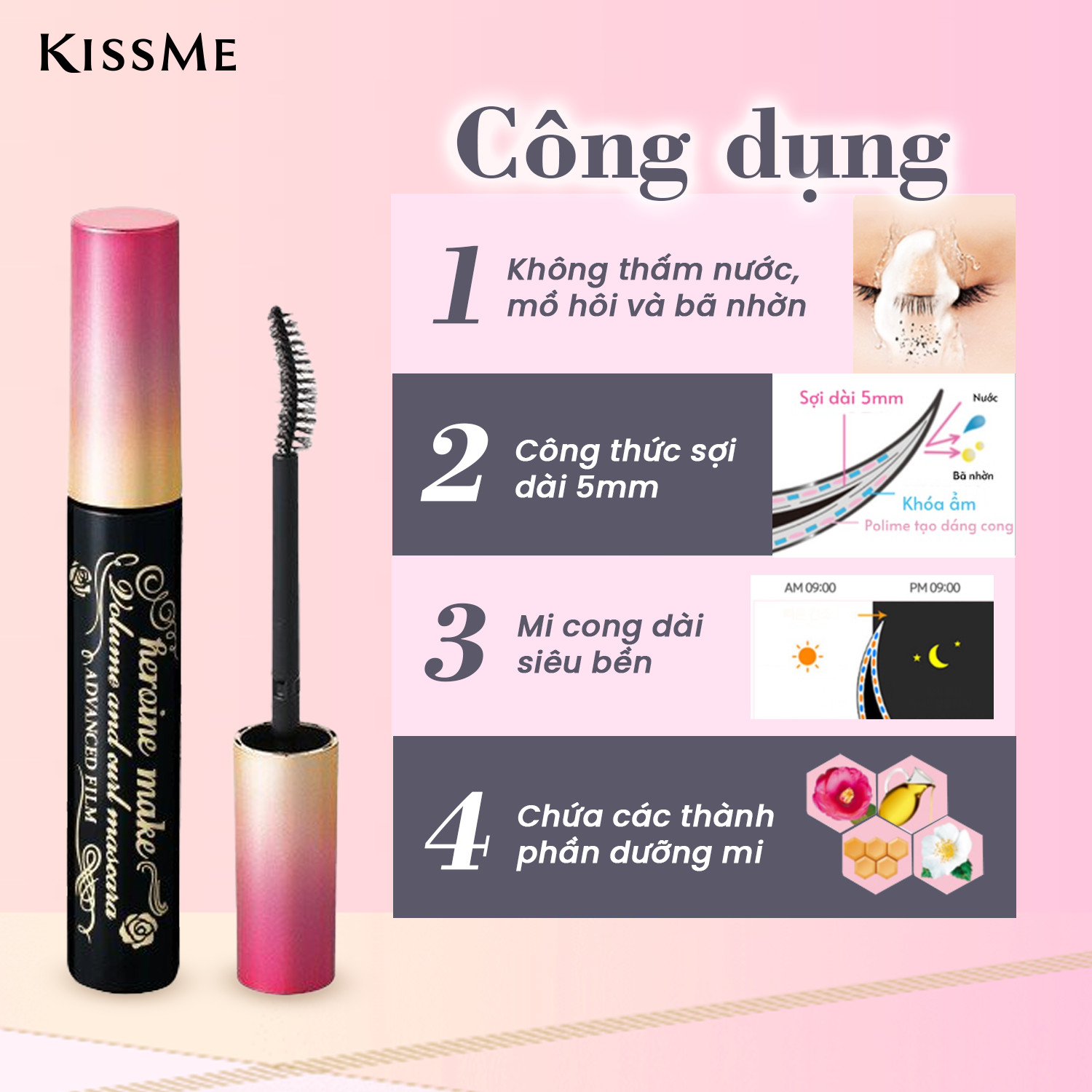 Thương hiệu: Kissme Xuất xứ: Nhật Bản HSD: 5 năm kể từ ngày sản xuất 1. Mascara Nâng Cong Dài Mi (6g): Mascara màu đen tuyền có chất mực được chiết xuất từ Nhân