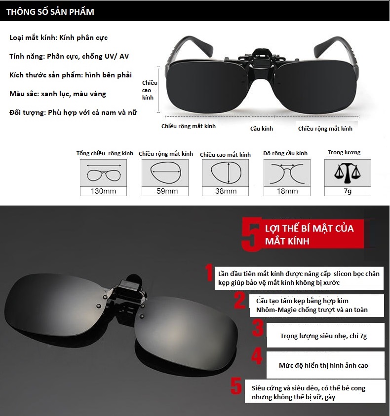 An toàn khi sử dụng.  Chất liệu cao cấp bền đẹp Thiết kế thời trang, phù hợp với mọi đối tượng Kính mắt kẹp phân cực là mẫu kính cao cấp. Thiết kế dành riêng