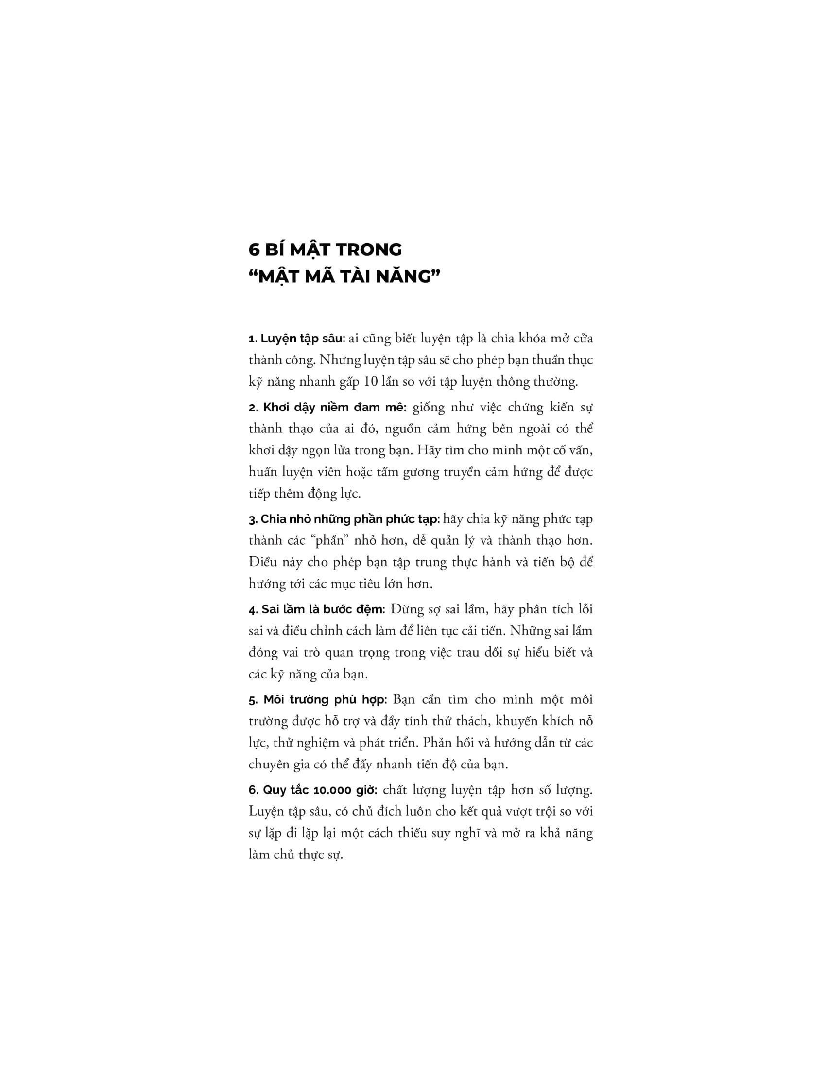 Dựa trên những thành tựu xuất sắc của ngành thần kinh học và nghiên cứu mới nhất trong quá trình đi tới 9 địa chỉ sản sinh ra rất nhiều tài năng của thế giới – từ sân bóng chày ở vùng Ca-ri-bê đến học viện âm nhạc cổ điển phía bắc New York – Coyle đã chỉ ra 3 yếu tố then chốt cho phép bạn phát triển tài năng và tối ưu hóa khả năng của m.ình trong các lĩnh vực thể thao, nghệ thuật, âm nhạc, toán học hay bất kỳ điều gì khác.