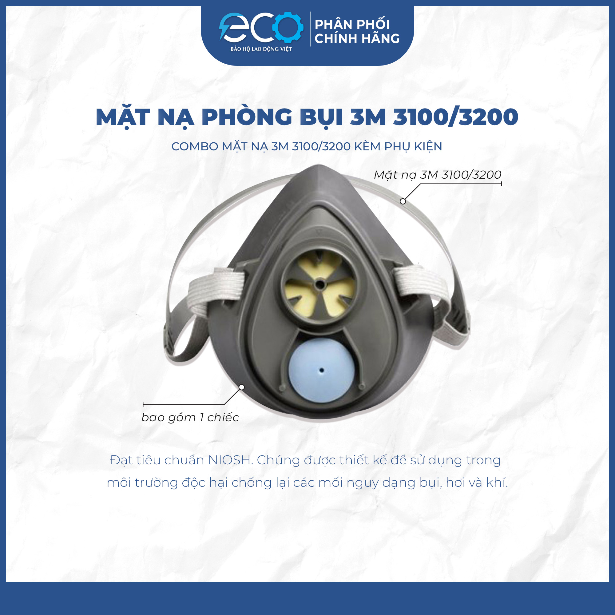 - 1 Nắp Giữ Tấm Lọc Bụi 3M 1700 Mặt nạ chống độc 3M 3100 là dòng sản phẩm bảo hộ lao động cao cấp. Mặt nạ nửa mặt 3100 đạt tiêu chuẩn NIOSH. Chúng được thiết kế để sử dụng trong môi trường độc hại chống lại các mối nguy dạng bụi, hơi và khí. ️ Thông tin sản phẩm mặt nạ chống độc 3M 3100, 3200