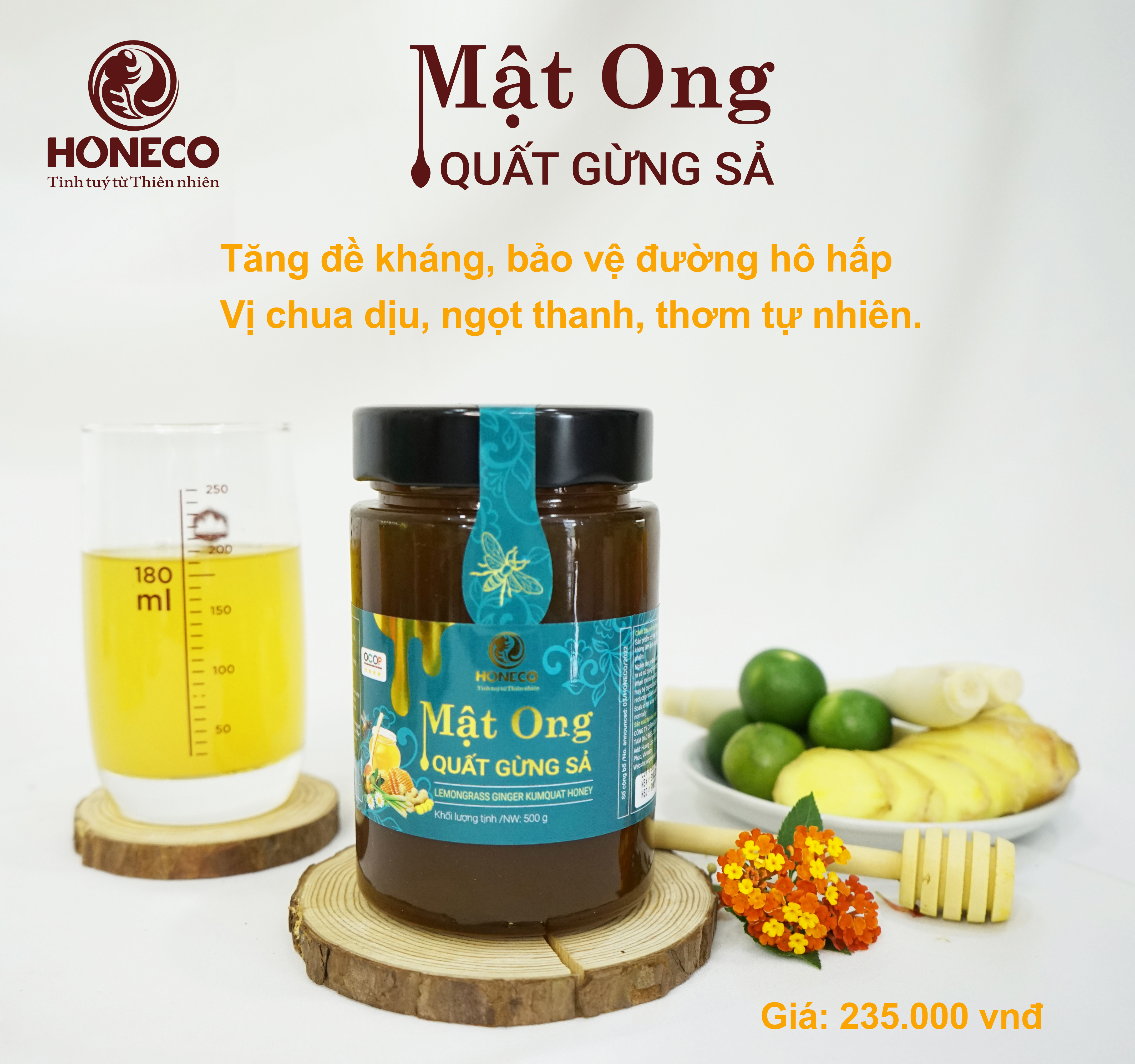 Mật ong quất gừng sả là sản vật đặc trưng của Việt Nam nói chung và của HONECO nói riêng, đặc biệt thơm ngon, bổ dưỡng mang đậm chất của sản vật vùng nhiệt đới, món quà quý để giới thiệu cho bạn bè năm châu.