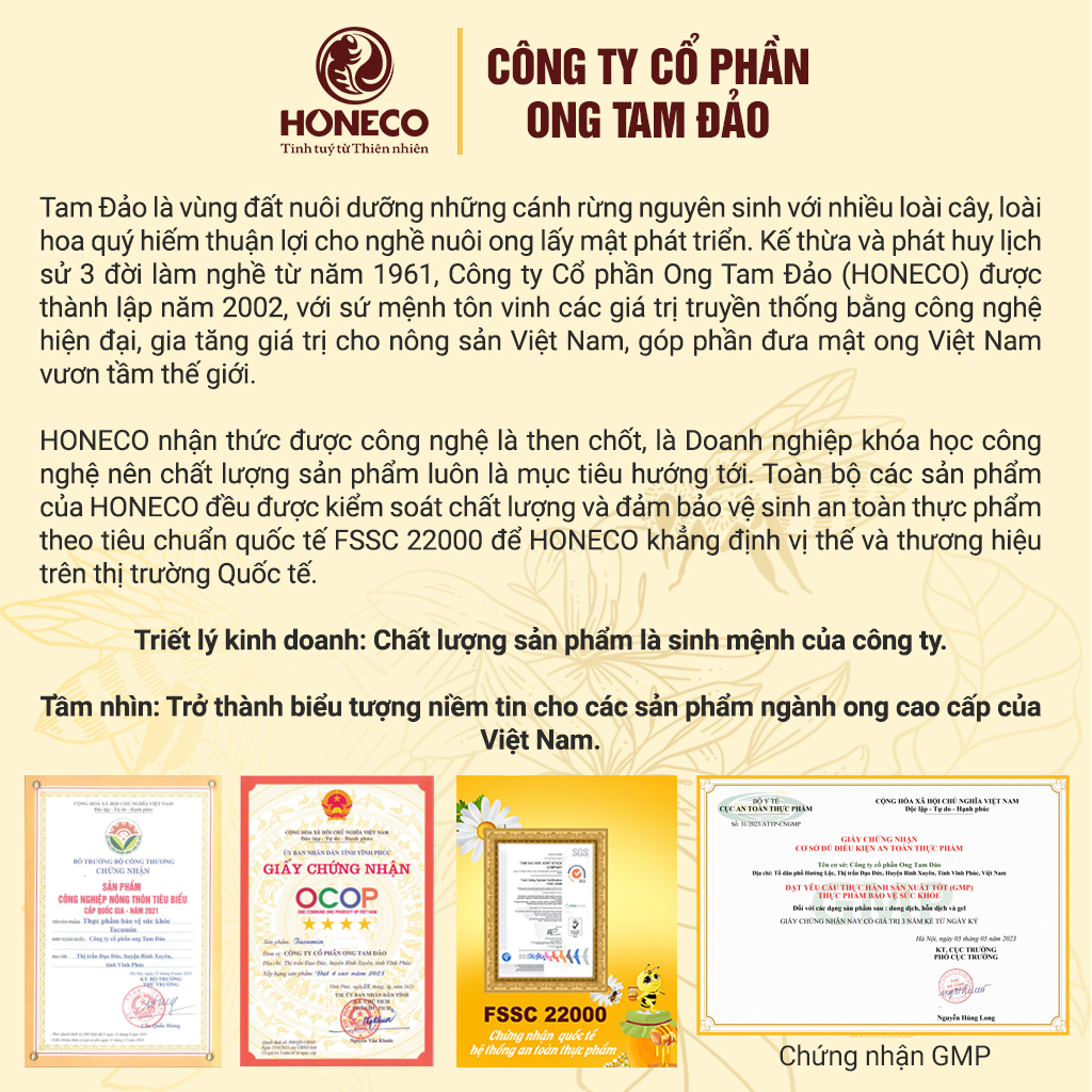 HONECO hiểu rằng “chất lượng sản phẩm là sinh mệnh của công ty”, nguồn nguyên liệu sản phẩm được tuyển chọn khắt khe, nguồn gốc rõ ràng, sản phẩm có nguồn gốc 100% từ tự nhiên, nói không với thuốc kháng sinh, thuốc bảo vệ thực vật, phẩm màu và chất phụ gia.