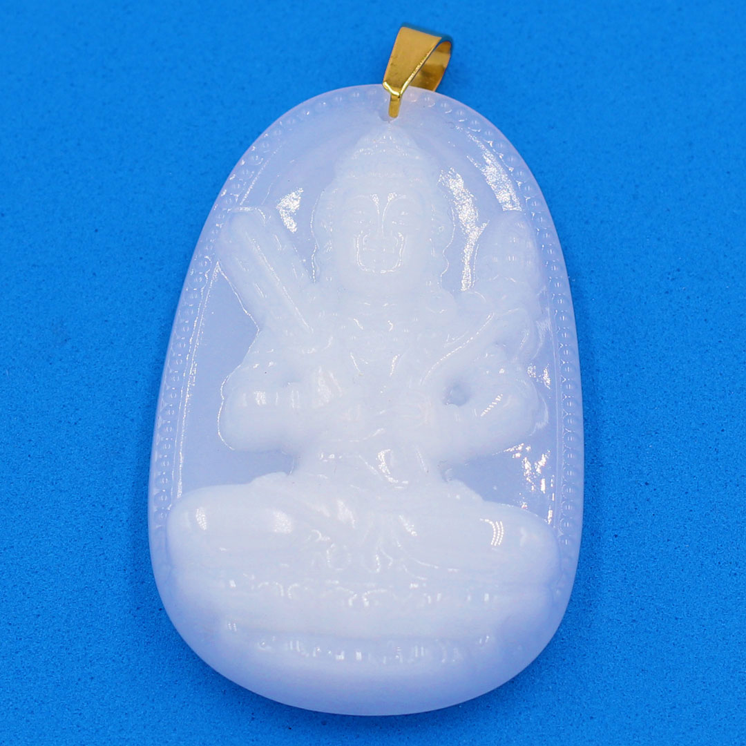 Mặt Phật Bà đứng Cẩm Thạch xanh trắng lí - Chất liệu: Ngọc Cẩm Thạch tự nhiên. - Màu sắc: Xanh lí phớt trắng - Kích thước: ngang 49mm, cao 23mm, dày 4mmx8mm - Mã kiểm định: 86691 - Tiêu chuẩn