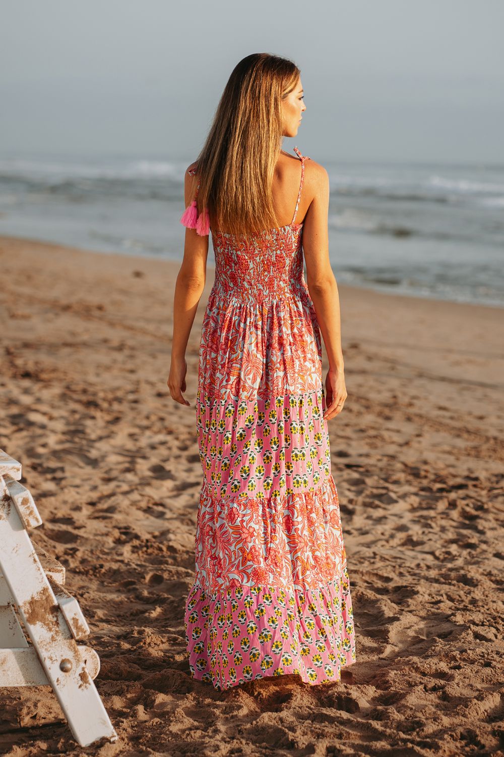 Maxi 2 Dây Isla Bonita, chất lụa mềm mại, thoáng mát. nền vải vẽ ánh kim tinh tế. Dây nơ rời cột nhẹ ở eo. Có thể mặc cột nơ hoặc không nơ như đầm