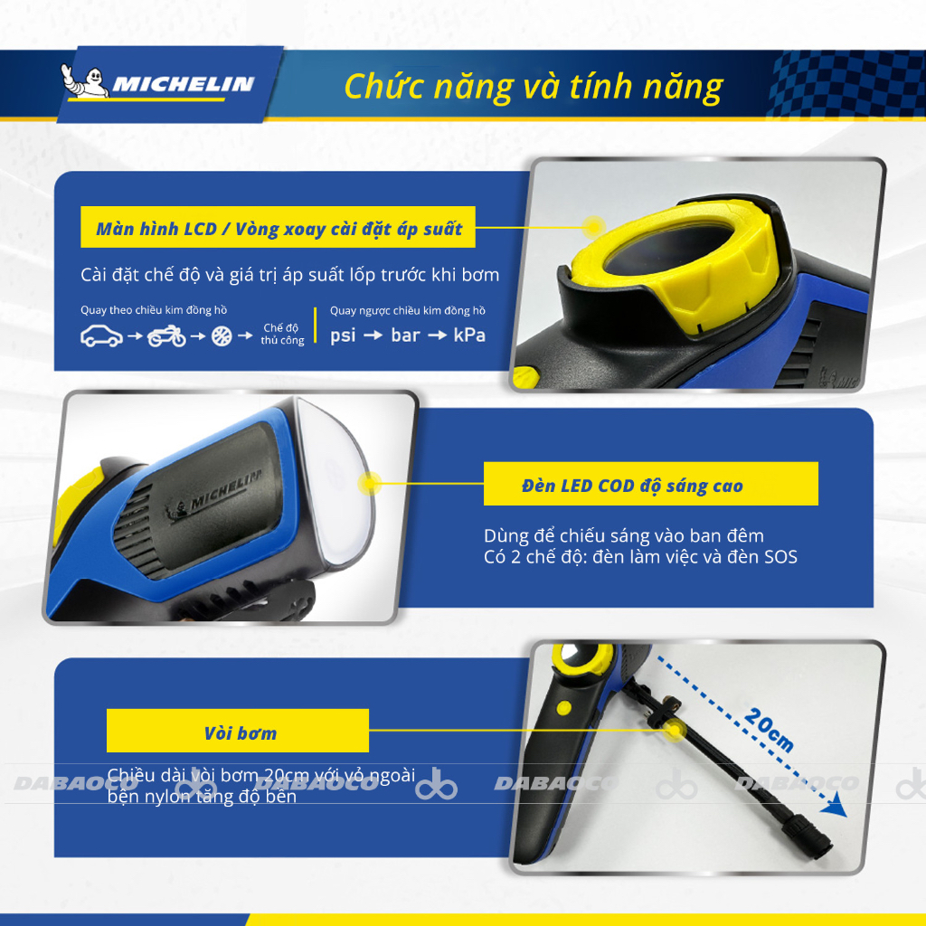 GIỚI THIỆU SẢN PHẨM Chuỗi máy bơm Michelin mới sử dụng kiểu mới QRV (Quick Release Valve: Van Xả Nhanh) với thiết kế độc nhất và công nghệ tiên phong. Chúng tôi luôn cam kết tập trung vào nghiên cứu và phát triển công nghệ, cải tiến sản phẩm và mang đến trải nghiệm tốt cho người tiêu dùng cũng như hỗ trợ khẩn cấp an toàn cho người tiêu dùng trên thế giới. Sản phẩm này thích hợp để bơm lốp xe hơi, xe đạp, xe máy và các vật dụng áp suất thấp như banh thể thao và các đồ chơi bơm hơi nhỏ. Đèn pha với thiết kế độc nhất giúp bạn lái xe ra khỏi chỗ tối và làm việc bình thường ở những nơi thiếu ánh sáng.