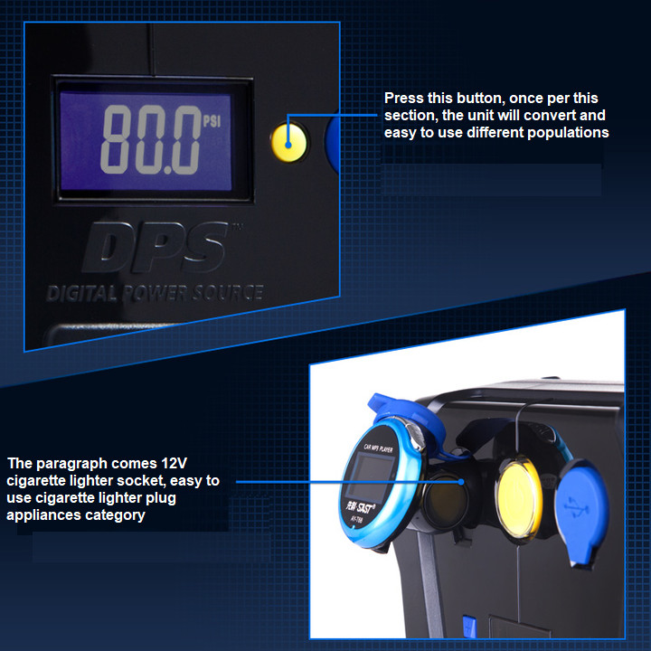 - Động cơ mạnh mẽ 180W cho áp suất tối đa 150PSI. Đèn LED 4 bóng ánh sáng trắng để soi ban đêm.