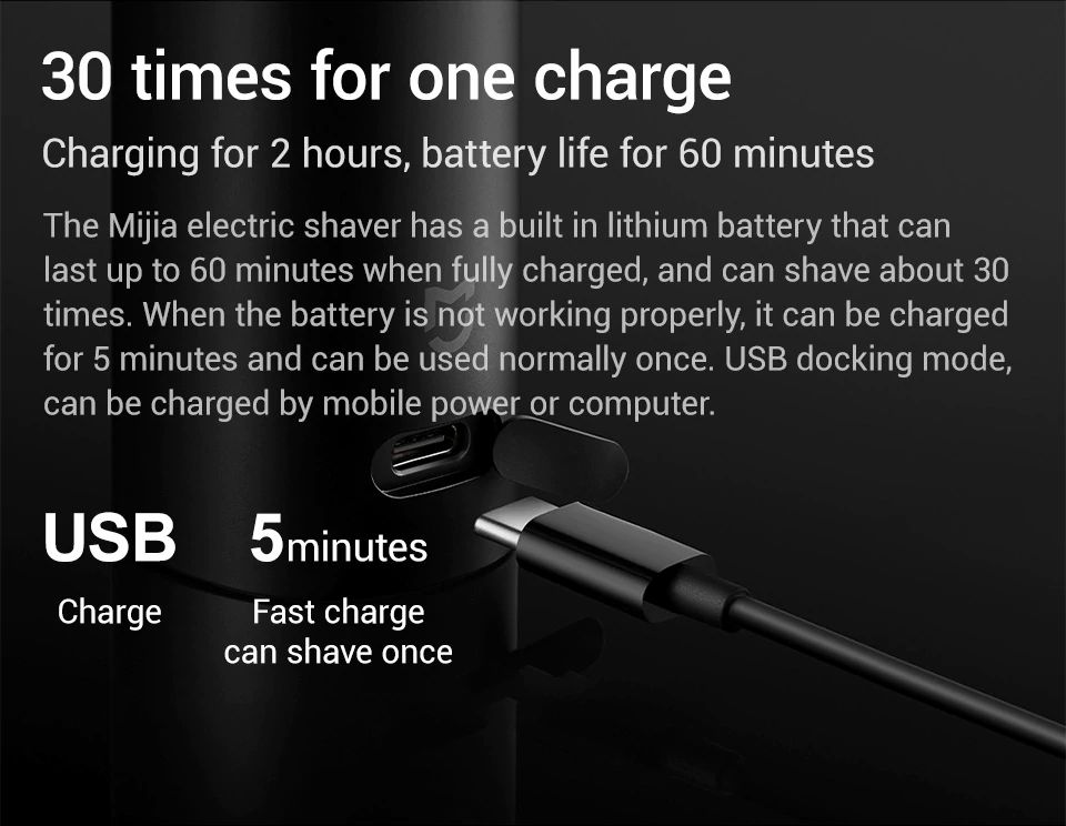 - Màu sắc: đen Máy cạo râu Mijia S500 là một thiết bị không thể thiếu cho các quý ông lịch lãm. Máy không những giúp bạn luôn giữ phong thái “mày râu nhẵn nhụi”, mà còn giúp tiết kiệm thời gian, công sức cho công việc chăm sóc vẻ ngoài của mình. Máy cạo râu Electric Shaver Mijia Xiaomi được cấu tạo từ hai bộ phận chính. Một là tay cầm có dạng trụ tròn và hai là phần dao cạo được thiết kế theo kiểu dáng như một con spinner hiện đại. Thiết kế khác lạ, độc đáo của chiếc máy cạo râu này không hề giống với bất cứ mẫu máy cạo râu thông thường nào. Lại nhỏ gọn (155 x 62mm) và sang trọng theo đẳng cấp quý ông nên rất thích hợp để bạn mang theo trong các chuyến công tác, du lịch hay chỉ đơn giản là sử dụng ở nhà. Tay cầm của máy cạo râu Electric Shaver Mijia Xiaomi được phủ một lớp bề mặt bằng hoạt chất PPG – PolyPropylene Glycol. Có tác dụng chống bám bẩn, chống bám vân tay và không làm xuống màu của thiết bị. Gần về cuối đuôi tay cầm là một dãy ký hiệu có tác dụng thông báo tình trạng hoạt động của thiết bị cho người dùng. Ký hiệu đầu tiên là chế độ quay của lưỡi dao. Tiếp theo là chế độ khóa an toàn, để thiết bị được bảo đảm không hoạt động khi không được khởi động. Tiếp theo là ký hiệu về chuẩn chống nước và cuối cùng là tình trạng pin trên thiết bị. Ngoài ra trên tay cầm còn có một nút nguồn để người dùng dễ dàng bấm mở. Máy cạo râu Electric Shaver Mijia Xiaomi được trang bị bộ dao thuộc hàng “cực phẩm”. Bao gồm 3 bộ dao đấu đầu 360o với nhau. Mỗi bộ dao được cấu tạo từ lưỡi dao kép giúp tăng 50% diện tích tiếp xúc với gương mặt người dùng. Nhờ vậy mà dao có thể linh động thích ứng với mọi đường nét phức tạp trên khuôn mặt người sử dụng và làm sạch mọi góc cạnh trên gương mặt chỉ với một lần cạo. Kết cấu của mỗi lưỡi dao trên máy cạo râu Electric Shaver Mijia Xiaomi được thiết kế 135 bánh răng và có khả năng xoay được 360o. Để nâng tính hiệu quả cho bộ lưỡi dao, nhà sản xuất đã nhập khẩu thép JPE từ Nhật Bản và bổ sung nguyên phụ liệu từ công ty SANDVIK Thụy Điển. Chính sự kết hợp tuyệt vời của hai tên tuổi lớn trong ngành sản xuất thép này đã đem đến bộ lưỡi dao có độ dày mỗi răng chỉ vỏn vẹn 0.08mm. Bộ lưỡi dao kép được thiết kế đối xứng các vòng cắt sẽ có tác dụng nâng bề mặt từng sợi râu và cắt gọn ghẽ không để lại dấu tích. Không những vậy, công nghệ gia công điện hóa ECM được ứng dụng trên thiết bị này cũng cho phép đem lại một vẻ ngoài hoàn thiện. Hoàn toàn không xuất hiện các gờ kim loại hay bất cứ mối hàn dư thừa nào. Máy cạo râu Electric Shaver Mijia Xiaomi sử dụng động cơ MABUCHI MOTOR 260 mạnh mẽ của Nhật Bản. Motor có momen xoắn lớn cùng tốc độ quay cao và hoạt động vô cùng ổn định. Việc sử dụng loại động cơ tân tiến này vào thiết bị sẽ giúp nâng tốc độ cắt lên đến 3.9m/s. Từ đó làm sạch nhanh chóng cho khuôn mặt của bạn. Máy cạo râu Electric Shaver Mijia Xiaomi được trang bị chuẩn chống thấm nước IPX7. Giúp bạn dễ dàng vệ sinh cho bộ dao mà không gây ảnh hưởng đến động cơ và linh kiện bên trong. Tuy nhiên khi sử dụng người dùng cần lưu ý không nên tắm, gội đầu và cạo râu cùng lúc vì lúc này da đang rất mỏng và nhạy cảm nên rất dễ bị kích thích gây tấy đỏ tại vị trí cạo. Thiết bị máy cạo râu lần này của Xiaomi cũng sử dụng pin lithium làm nguồn cung năng lượng chính. Khi pin yếu bạn có thể sạc nhanh chóng cho thiết bị bằng bộ sạc USB trong 5 phút. Trong khi ở chế độ sạc thường bạn chỉ cần mất 2 giờ để sạc từ nguồn điện máy tính hay thiết bị di động. Sau mỗi lần sạc đầy, pin có khả năng dùng để cạo 30 lần trong vòng 1 tiếng. Từ đó giúp bạn đánh bay mọi lo lắng về vẻ ngoài của mình trong nháy mắt.