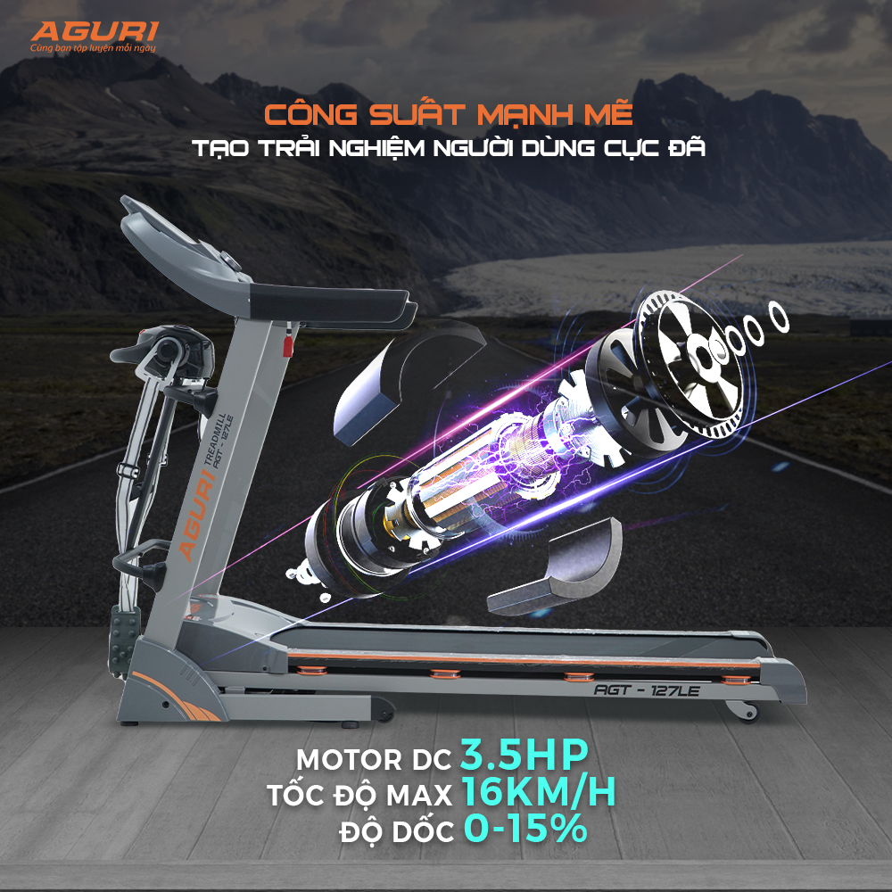 Máy chạy bộ AGURI AGT-127LE - máy chạy bộ tại nhà Đây là máy chạy bộ chính hãng của thương hiệu AGURI - Máy tập của Cầu thủ Công Phượng. Là mẫu máy chạy bộ giá tốt được nhiều người tiêu dùng lựa chọn. Một mẫu máy chạy bộ gấp gọn dễ dàng, tiết kiệm không gian cho người dùng.