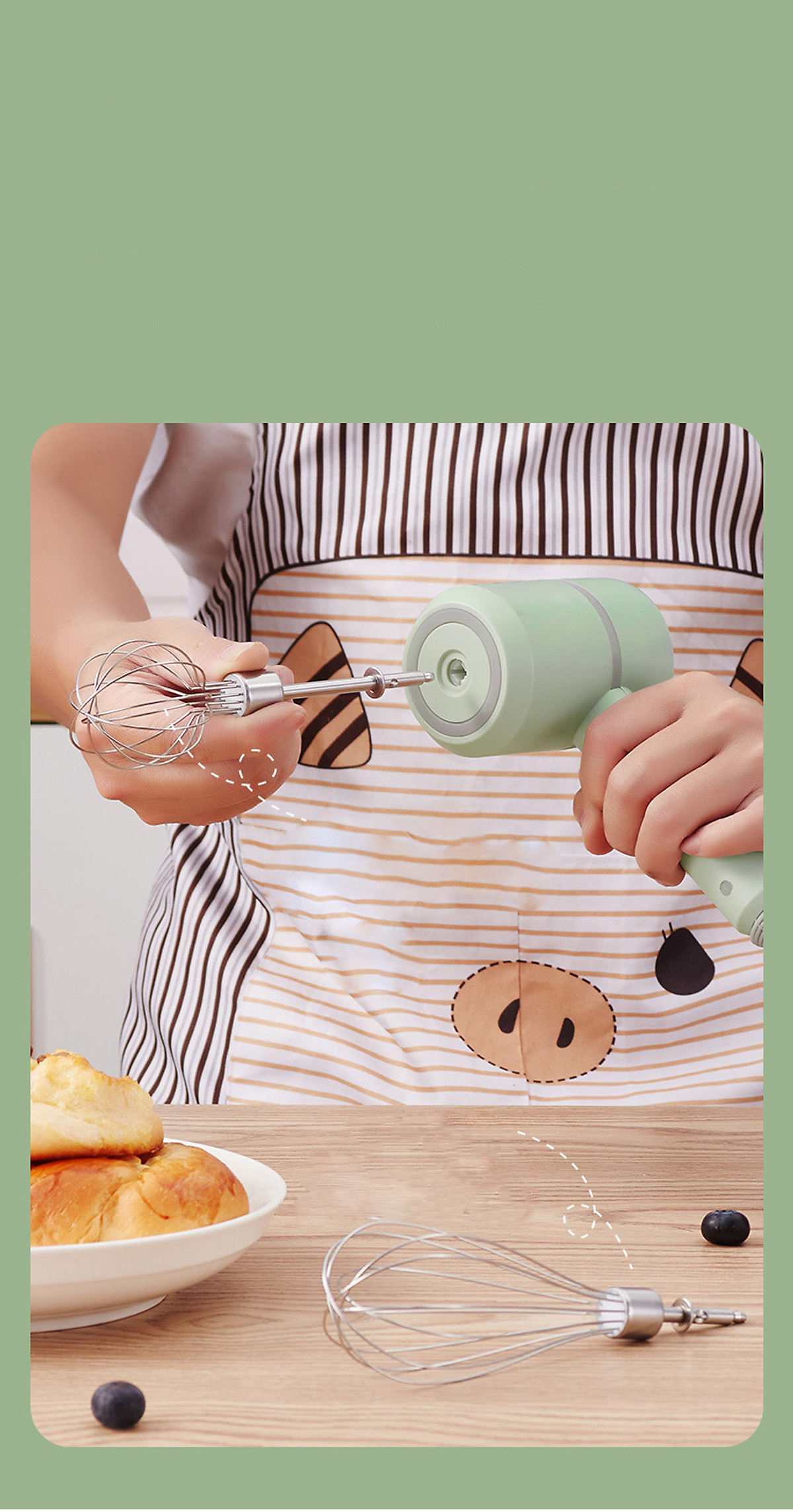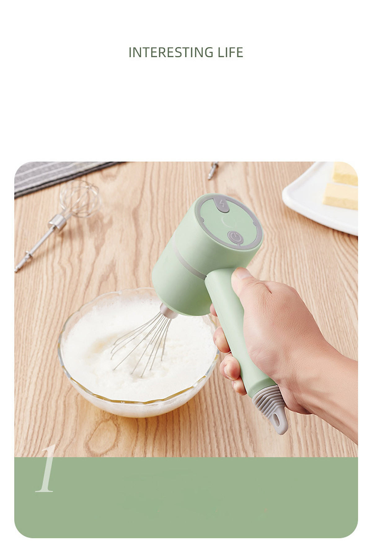 Đi kèm 2 que trộn inox có thể tháo rời để vệ sinh rất dễ dàng và 1 vợt tách lòng đỏ