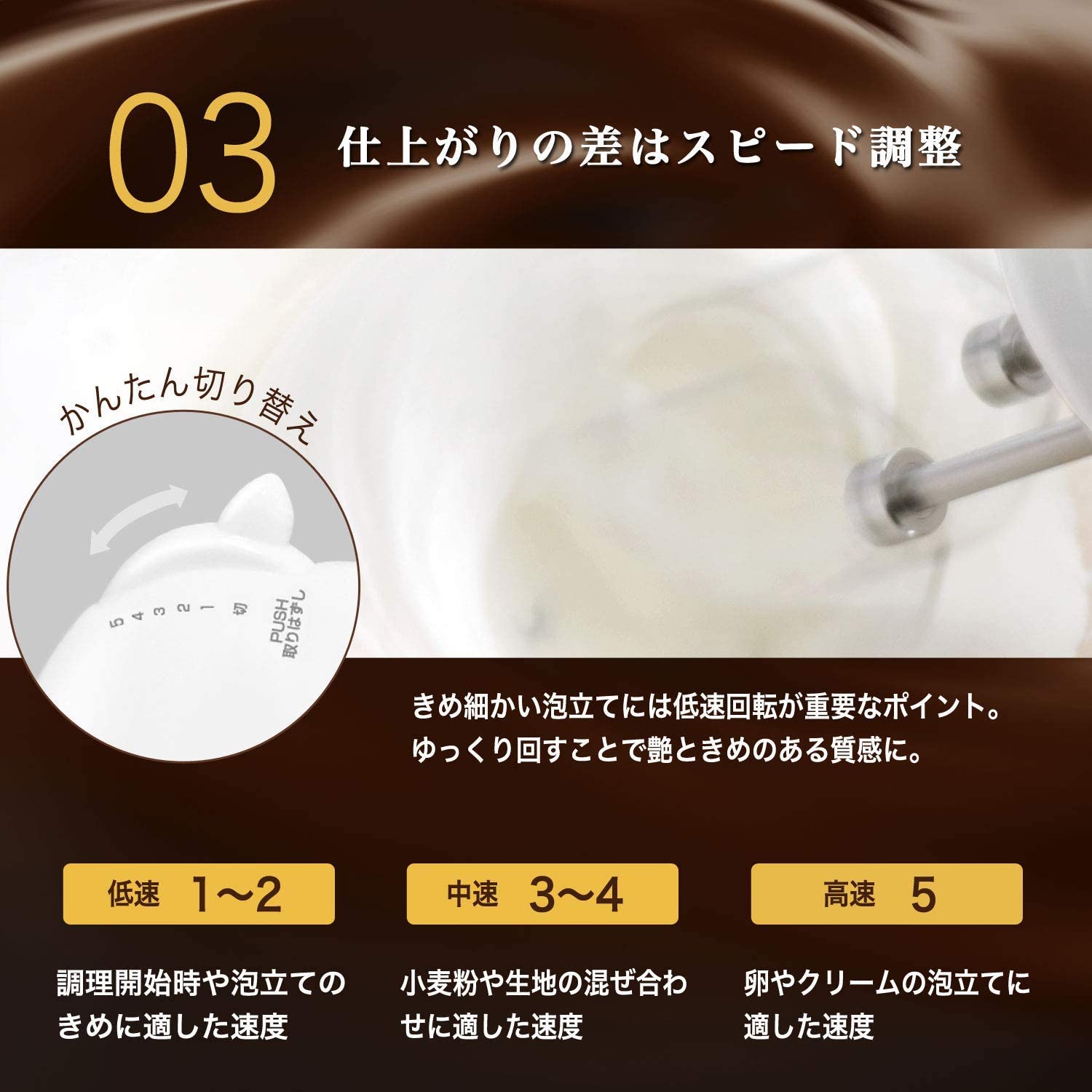 Động cơ 375W êm ái nhưng mạnh mẽ 4 mức tốc độ. Thêm nút quay nhanh Thích hợp sử dụng bằng tay phải hoặc trái Dễ vệ sinh Có nút nhả cho thanh đánh trứng