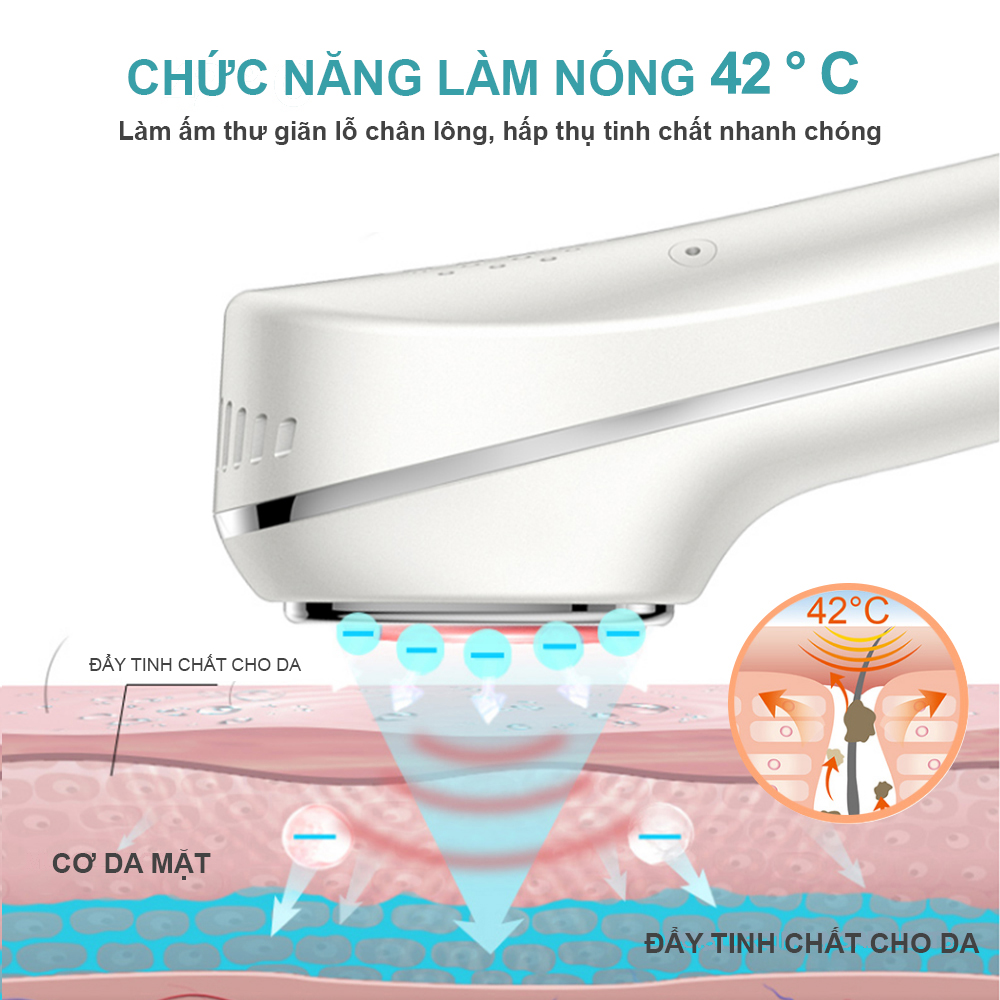 - Đẩy tinh chất dưỡng da ở 42 độ C: Nhiệt độ mở lỗ chân lông để tinh chất (serum) nhanh chóng thấm sâu vào da.