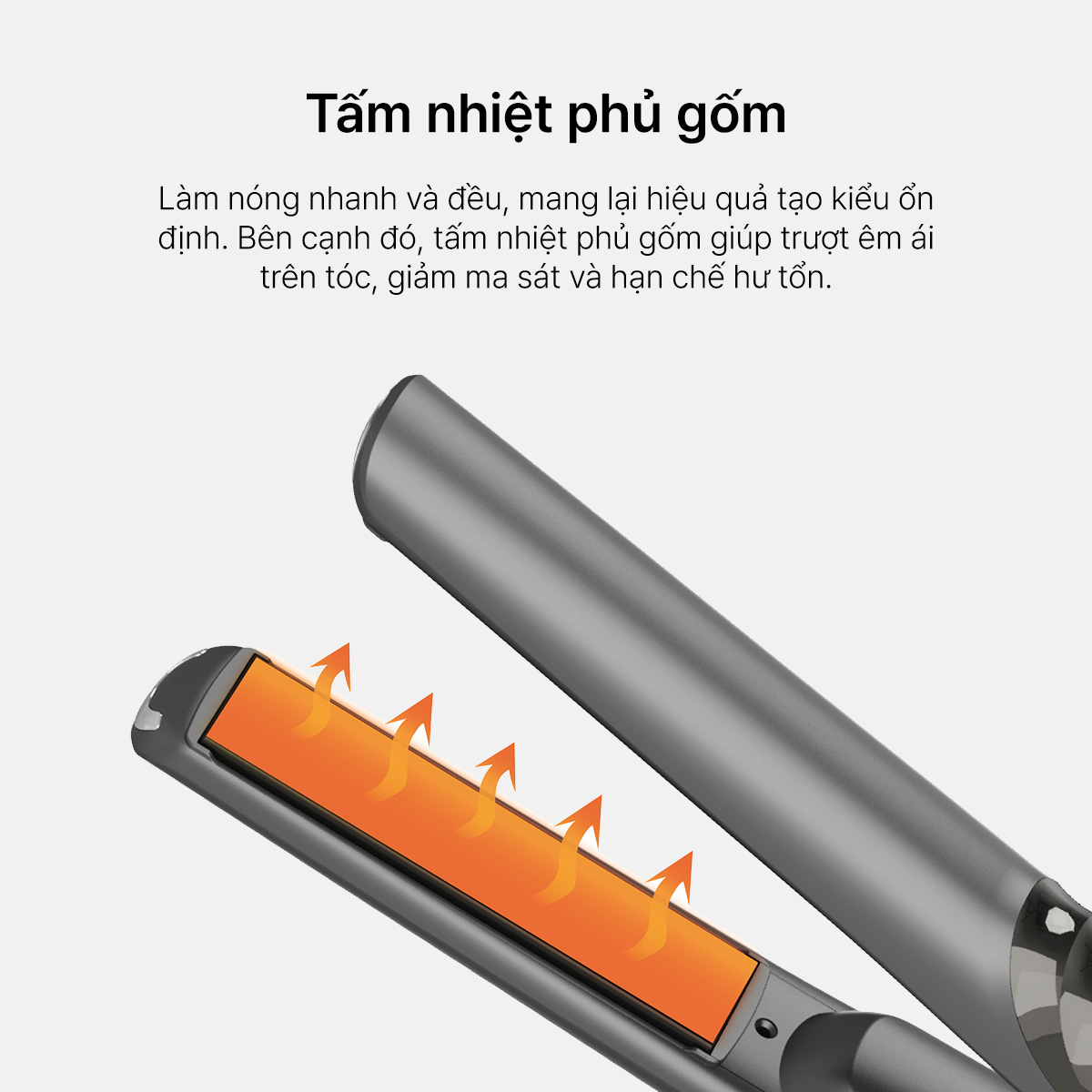 TẤM NHIỆT PHỦ GỐM: Làm nóng nhanh và đều, mang lại hiệu quả tạo kiểu ổn định. Bên cạnh đó, tấm nhiệt phủ gốm giúp trượt êm ái trên tóc, giảm ma sát và hạn chế hư tổn