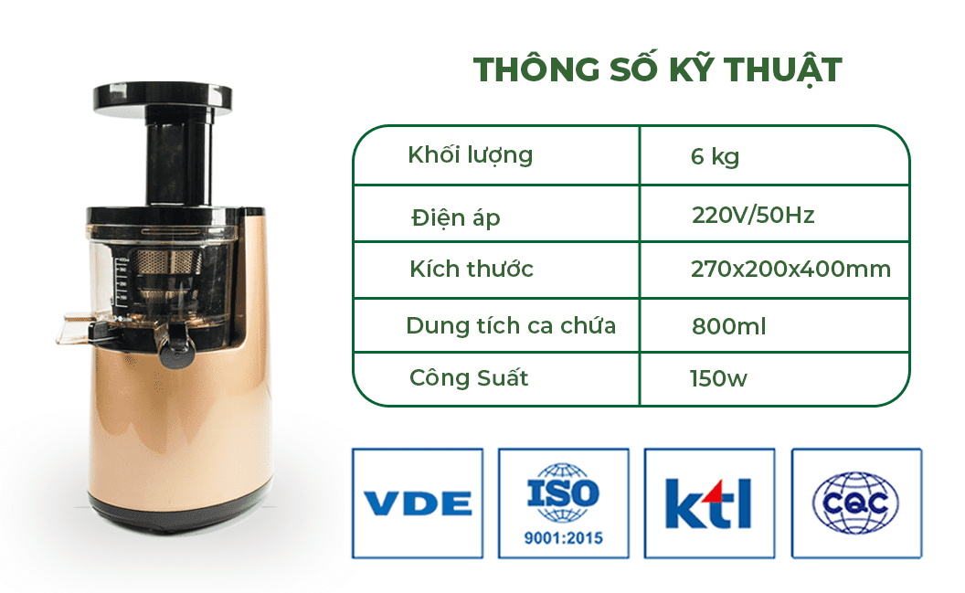 ƯU ĐIỂM SẢN PHẨM: - Động cơ 100% bằng đồng mạnh mẽ và bền bỉ - Công suất cực lớn 250W giúp nghiền nát các nguyên liệu cứng - Tốc độ ép