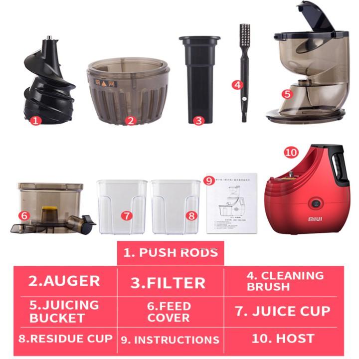 Ưu điểm nổi trội của máy ép chậm so với máy ép trái cây thông thường - Đường kính lớn 7.8cm, không cần cắt nhỏ, ép trực tiếp - Tỷ lệ nước ép nguyên chất