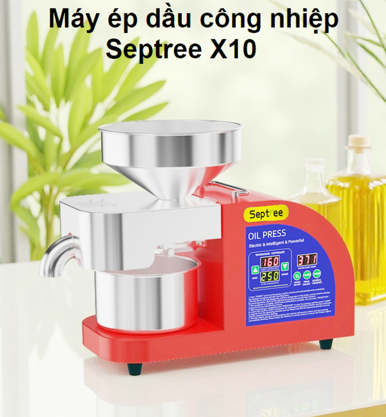 - Máy ép dầu thực vật công nghiệp Septree X10 với tính năng ưu việt, giúp bạn tự tay mình làm ra những chai dầu vàng óng, nguyên chất 100% từ những nguyên liệu hữu cơ: Lạc (đậu phộng), vừng (mè), dừa, hướng dương, đậu nành,… Máy ép dầu Septree X10 là sản phẩm được các đầu bếp lựa chọn nhiều nhất hiện nay, bởi tính năng mang lại cho người sử nguồn thực phẩm sạch, an toàn cho sức khỏe.
