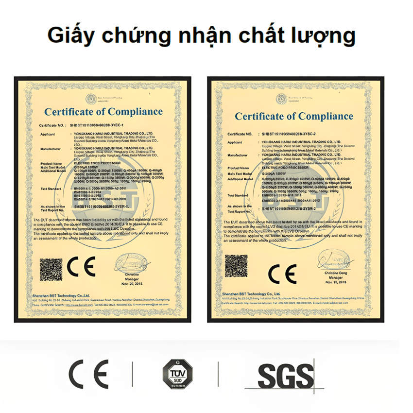 - Chứng nhận chất lượng Châu Âu: 3C, CE, EMC, ROHS, ERP, LFGB, REACH, FCC