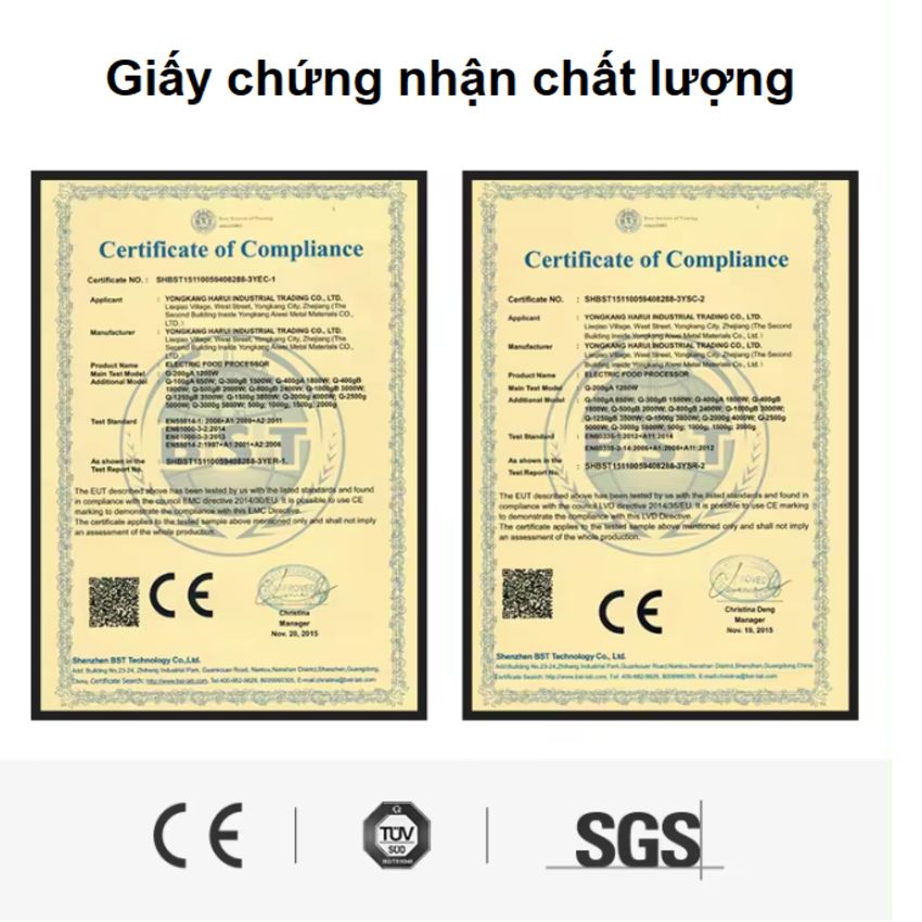 - Chứng nhận chất lượng Châu Âu: ROHS, 3C, CE, EMC, ERP, LFGB, REACH, FCC