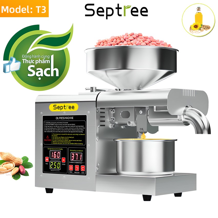 - Máy ép dầu thực vật gia đình và nhà hàng Septree T3 với tính năng ưu việt, giúp bạn tự tay mình làm ra những chai dầu vàng óng, nguyên chất 100% từ những nguyên liệu hữu cơ: Lạc (đậu phộng), vừng (mè), dừa, hướng dương, đậu nành,… Máy ép dầu Septree T3 là sản phẩm được người tiêu dùng lựa chọn nhiều nhất hiện nay, bởi tính năng mang lại cho người sử nguồn thực phẩm sạch, an toàn cho sức khỏe. Ưu điểm nổi bật của máy ép dầu thực