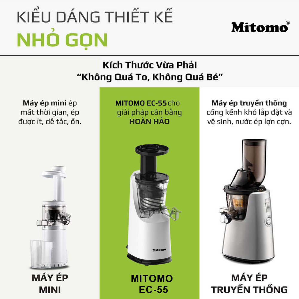 Máy ép chậm, máy ép trái cây Mitomo EC-55 chính hãng bảo hành 3 năm Máy ép trái máy ép chậm giúp ép siêu kiệt bã đến 95%, với thiết kế kiểu dáng máy ép