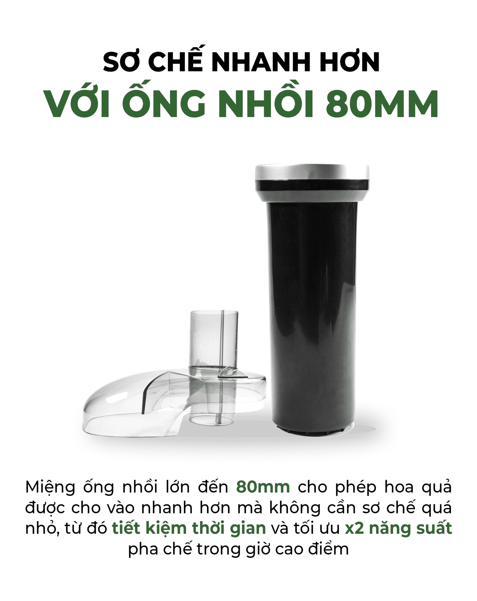 Dung tích lớn - Ép nhiều hơn mỗi lần Khoang chứa bã dung tích lớn - 2,0 L, cho phép ép tới 10 quả táo hoặc nhiều loại trái cây, rau củ cùng lúc. Nhờ