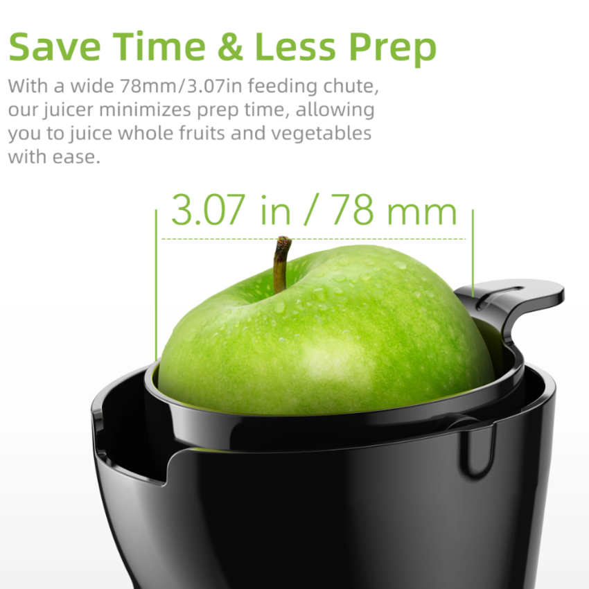 Ép kiệt hơn, giàu Vitamin và nhiều hương vị hơn! Đường kính khoang ép lớn lên đến 130mm, giúp ép nguyên quả dễ dàng mà không cần cắt nhỏ. Tốc độ quay chậm chỉ 40