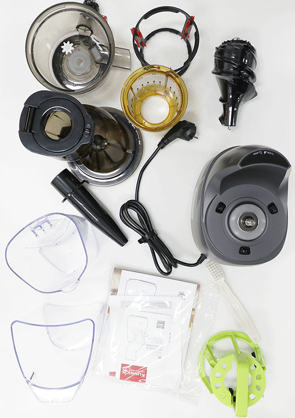 Kèm sách hướng dẫn công thức các loại nước ép Ngoài ra, máy ép trái cây tốc độ chậm Kuvings có sách hướng dẫn công thức làm các loại nước ép, Soup, Mojito, Cocktails, Sinh tố và Kem hoa quả, dụng cụ vệ sinh (chổi xoay và bàn chải), ca đựng nước ép và ca đựng bã ép kèm theo sản phẩm tiện lợi phục vụ những ly nước ép với hương vị phong phú hơn, màu sắc tươi hơn và giữ được toàn bộ dinh dưỡng của trái cây và rau củ quả mà không bị tách nước nhanh cho gia đình bạn.