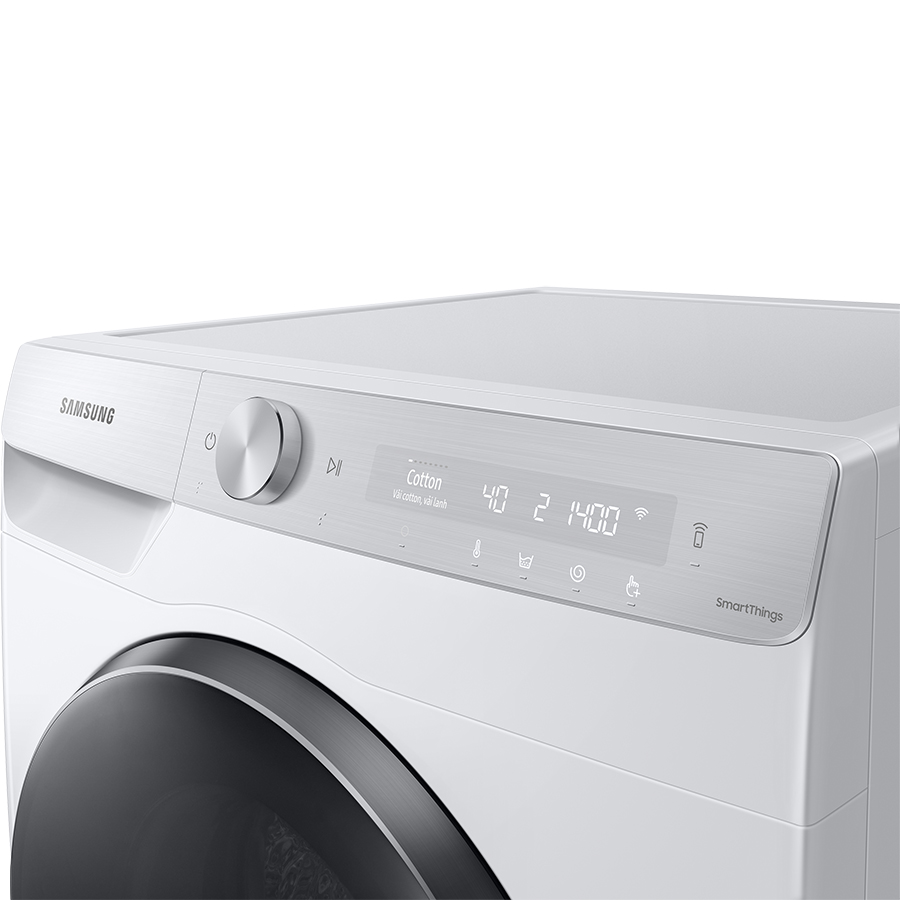 Bảng điều khiển thông minh AI Control Bảng điều khiển AI tự động ghi nhớ, phân tích, đề xuất chế độ giặt và cài đặt yêu thích dựa trên thói quen sử dụng, mà không cần tùy chỉnh mỗi lần giặt. Màn hình hiển thị quy trình giặt dễ hiểu, hướng dẫn thông minh và kết nối với điện thoại qua ứng dụng SmartThings* điều khiển máy giặt mọi lúc mọi nơi.