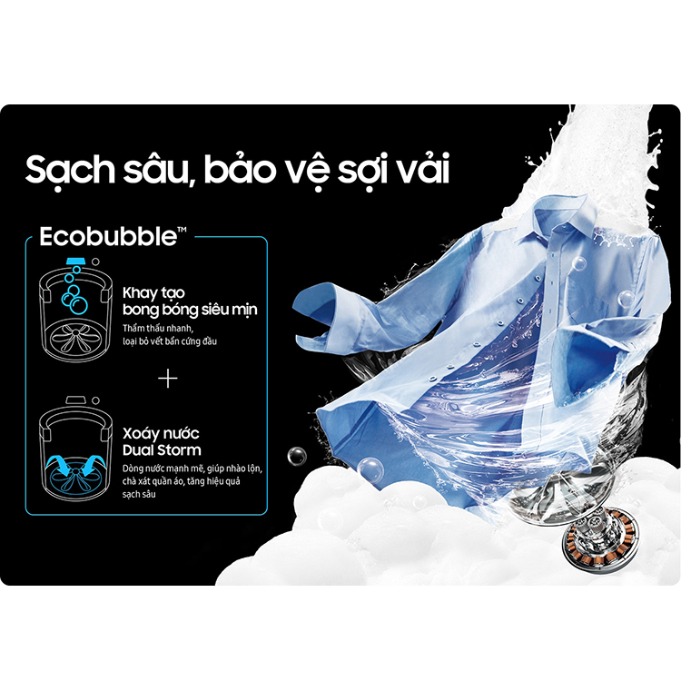 - ĐƯỢC KHUI THÙNG KIỂM TRA sản phẩm trước khi thanh toán/ký nhận Bong bóng siêu mịn Ecobubble Máy giặt Samsung Inverter 14 kg WA14CG5886BDSV với sự kết hợp giữa bong bóng siêu mịn và xoáy nước siêu mạnh, đánh bật vết bẩn tối đa, đồng thời bảo vệ sợi vải tốt hơn 20%. Công nghệ Ecobubble kết hợp với động cơ Digital Inverter tiết kiệm đến 60% điện năng và 11% nước, tối thiểu chi phí cho người dùng. Động cơ Digital Inverter Động cơ Digital Inverter trang bị nam châm vĩnh cửu, giúp máy vận hành êm ái, bền bỉ, tiết kiệm 60% điện năng. Động cơ được bảo hành 20 năm thể hiện cam kết chất lượng vượt trội. Vòi phun siêu tốc Speed Spray Vòi phun siêu tốc với lực nước mạnh mẽ, tăng tốc độ thẩm thấu xà phòng, giảm 40% thời gian giặt, tiết kiệm 20% nước mà vẫn đảm bảo hiệu quả sạch sâu. Giặt hơi nước Hygiene Steam Giặt hơi nước giúp loại bỏ 99.9% vi khuẩn và các tác nhân dị ứng, đồng thời đánh bật vết bẩn bám sâu. Phù hợp với đồ trẻ em, chăn ga, khăn, đồ nội y. SmartThings Điều khiển máy giặt từ xa với ứng dụng SmartThings: tự động đề xuất chu trình giặt phù hợp theo thói quen sử dụng, giúp bạn lên kế hoạch giặt giũ hàng ngày. HomeCare Wizard hướng dẫn bạn khắc phục sự cố từ xa một cách dễ dàng. Chế độ Eco Tub Clean Tự động vệ sinh lồng giặt loại bỏ vi khuẩn, mùi, cặn bám mà không cần dùng chất tẩy rửa. Chế độ Deep Softener Chế độ Deep Softener tối ưu quy trình xả, giúp lưu giữ hương thơm bền lâu hơn với cùng một lượng nước xả vải. Lọc xơ vải, cặn bám Bộ lọc lưới kép lọc sạch xơ vải & cặn bám khỏi quần áo trong quá trình giặt, tránh tắc nghẽn đường dẫn. Chế độ giặt kỹ Intensive Wash Chế độ Intensive Wash có thể được sử dụng trong bất kỳ quy trình giặt nào. Nhanh chóng hòa tan bột giặt và giúp nước thẩm thấu sâu vào vải, nhằm loại bỏ hiệu quả các vết bẩn cứng đầu như trà, rượu hoặc mỹ phẩm. Chống rung ồn VRT Plus Giặt giũ siêu êm ái với công nghệ VRT Plus triệt tiêu rung ồn trong quá trình giặt. Thiết kế khung máy mới mang lại sự ổn định cao hơn, kết hợp với bộ cảm biến phát hiện rung ồn, từ đó tối ưu hiệu quả vận hành của động cơ. Chẩn đoán sự cố với Smart Check Hệ thống theo dõi lỗi tự động Smart Check sẽ phát hiện, chẩn đoán sự cố và cung cấp giải pháp thông qua ứng dụng điện thoại.* Tiết kiệm thời gian và tối ưu chi phí cho dịch vụ sửa chữa. Cửa đóng siêu êm Thiết kế cửa vững chắc với van điều tiết làm chậm chuyển động, giúp cửa đóng mở an toàn, nhẹ nhàng. Điều khiển dễ dàng, an toàn Giúp sử dụng dễ dàng và không lo nước tràn lên bề mặt màn hình bảng điều khiển. Thiết kế nghiêng về sau của bảng điều khiển Rear Control giúp hạn chế tối đa việc tiếp xúc với nước, cho bạn an tâm sử dụng.