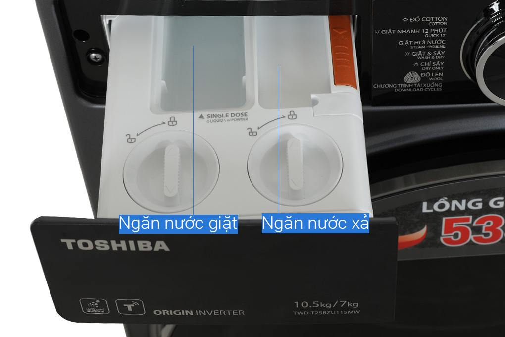 - Sản phẩm đạt nhãn năng lượng 5 sao với hiệu suất sử dụng điện ~9.5 Wh/kg. Hình ảnh chỉ mang tính chất minh họa Công nghệ tiết kiệm nước/bột giặt/thời gian - Tự phân bổ nước giặt và nước xả SenseDose: Thiết kế với 2 ngăn nước giặt và nước xả riêng biệt. Lúc này, máy giặt sẽ dựa vào khối lượng quần áo hiện có trong lồng giặt, để điều chỉnh và sử dụng lượng nước giặt và nước xả phù hợp để mang lại hiệu quả giặt sạch tối ưu. Hình ảnh chỉ mang tính chất minh họa Tiện ích - Kết nối Wifi và điều khiển từ xa qua phần mềm TSmartLife: Bạn có thể cài đặt ứng dụng TSmartLife trên điện thoại, để điều khiển từ xa các chức năng của máy giặt Toshiba 10.5 kg này một cách nhanh chóng. Ngoài ra, bạn có thể chia sẻ quyền điều khiển cho các thành viên trong gia đình và khắc phục sự cố sớm nhất có thể. - Hẹn giờ giặt: Tùy chỉnh thời gian giặt kết thúc theo thời gian rảnh của cá nhân, thuận tiện cho bạn sắp xếp công việc nhà để không làm ảnh hưởng đến công việc chính của bạn. - Khóa trẻ em: Tránh trẻ nhỏ nghịch phá mở cửa khi máy giặt đang hoạt động, từ đó đảm bảo an toàn cho trẻ và hiệu quả giặt sạch. - Thêm đồ trong khi giặt: Bạn có thể thêm đồ vào lồng giặt qua cửa phụ mà không cần phải nhấn nút tạm ngưng, từ đó đảm bảo thời gian giặt giũ không bị ảnh hưởng. *Hình ảnh chỉ mang tính chất minh họa