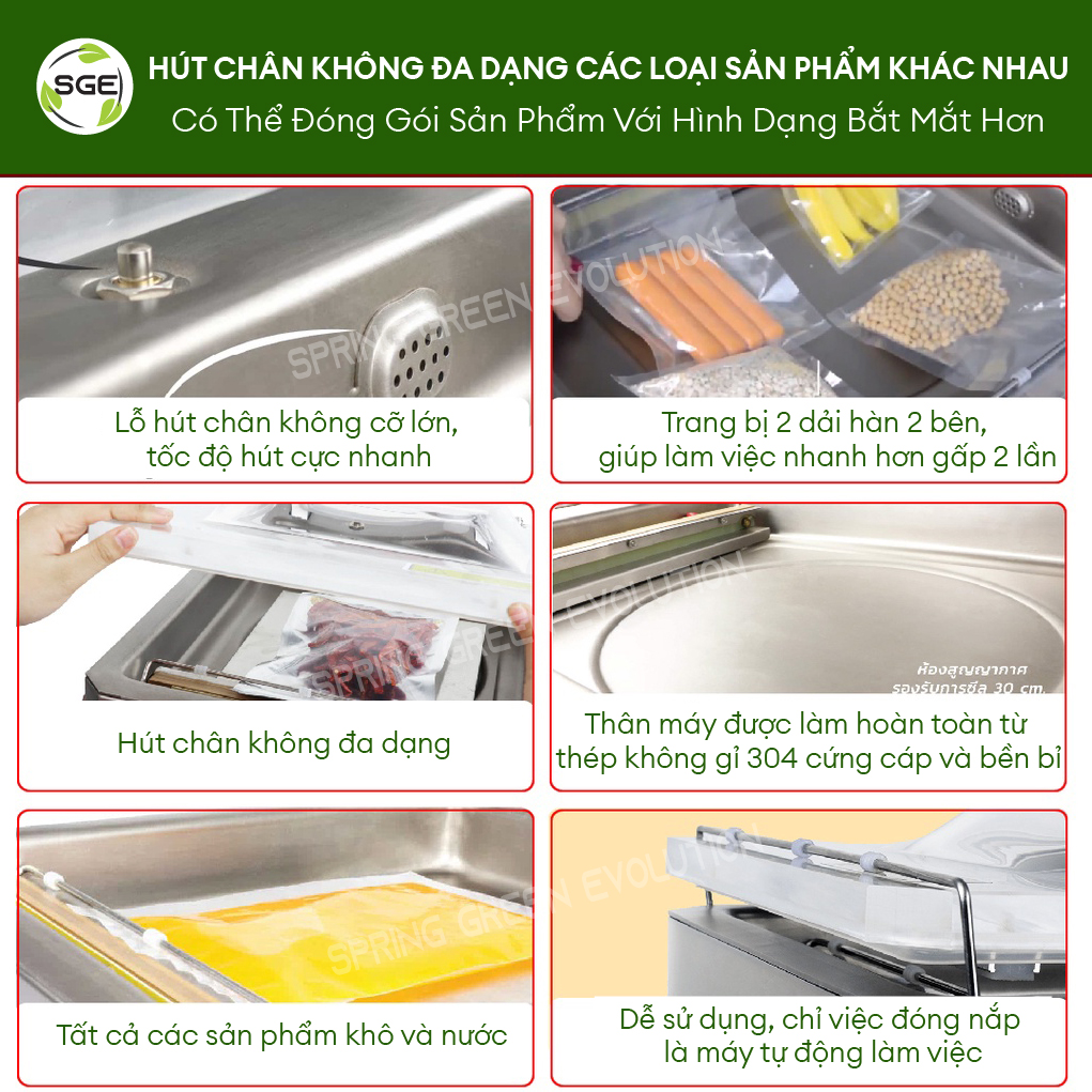 - Trang bị bánh xe, giúp di chuyển thuận tiện MÁY HÚT CHÂN KHÔNG CÔNG NGHIỆP BUỒNG ĐƠN VCC03/VCC04 Máy ép chân không kiểu buồng, mẫu VCC03 và VCC04 được thiết kế với kích thước lớn, thích hợp sử dung cho nhiều loại thực phầm như: đồ khô, ướt, loại thực phẩm có dạng bột, các loại nước sốt hay các loại chất lỏng khác nhau. Đặc biệt, phần đế được thiết kế thêm bánh xe, giúp cho việc di chuyển thuận tiện hơn. Đây là loại có tốc độ làm việc nhanh, cùng tính năng có thể điều chỉnh các chế độ trong quá trình hàn miệng túi, điều chỉnh thời gian hút chân không sao cho phù hợp với các loại sản phẩm khác nhau như có thể cài đặt nhiệt độ của dải hàn thích hợp cho từng loại hình sản phẩm cũng như số lượng của loại sản phẩm đó với với dải hàn có độ rộng lên đến 8 mm.(nghĩa là có thể hàn được cả hai bên hay nói cách khác là có thể hàn được 2 túi cùng lúc) , điều này giúp đảm bảo rằng quá trình hàn mép túi đạt hiệu quả cao, mép hàn dày dặn, chắc chắn không hề có vết nứt nào trên mép hàn. Thân máy được làm từ chất liệu Inox 304 chắc khỏe với độ bền cao. Đặc biệt,phần đế của máy được thiết kế thêm bánh xe đẩy có khóa, thuận tiện trọng việc di chuyển (Trọng lượng máy 63kg). Nắp máy làm từ chất liệu acrylic dày dặn, giúp ngăn chặn đường ra vào của luồng không khí, giúp quá trình hút chân không của toàn bộ hệ thống máy được xử lý nhanh chóng và đạt hiệu quả cao KÍCH THƯỚC MÁY ÉP CHÂN KHÔNG BUỒNG VCC03/VCC04 TÍNH NĂNG SẢN PHẨM MÁY HÚT CHÂN KHÔNG CÔNG NGHIỆP Máy hút chân không đa di năng nhất ở thời điểm hiện tạiBuồng hút rộng rãi, hút được đủ mọi thể loạiHút chân không cả đồ khô và đồ có nước. Hai dải hàn hai bên, cực kì năng suấtSử dụng kết hợp được với mọi loại túi. Giảm chi phí đầu tư đến hơn 50%Có thể tùy chỉnh thời gian hàn – hút – nghỉ. Lực hút cực mạnh, đảm bảo không rò rỉDải hàn rộng đến 8mm, hàn miệng túi cực kì chắc chắnNắp máy acrylic trong suốt, chắc chắn và dễ quan sátLỗ hút chân không cỡ lớn, tốc độ hút cực nhanhMÁY HÚT CHÂN KHÔNG SGE TỐT NHƯ NÀO?