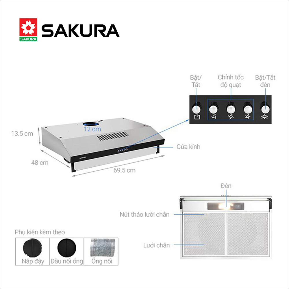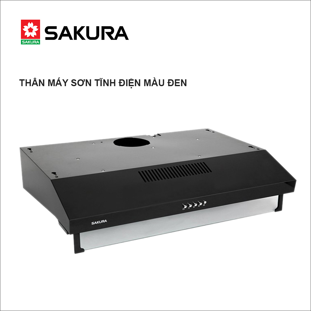 -Máy hút khói SAKURA, treo tủ kệ -Hút - xả trực tiếp bằng ống thoát -Khử mùi bằng than hoạt tính -Thân máy inox -2 motor, 3 nấc tốc độ, 1 đèn chiếu sáng -Lưới