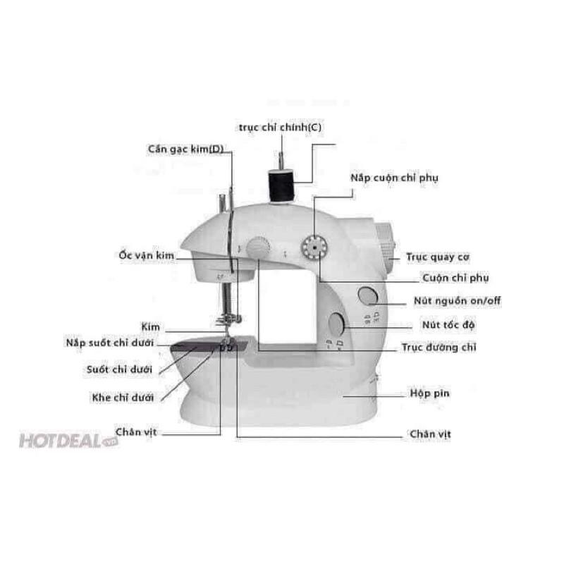 – Gồm: 1 thân máy, 1 cáp sạc, 1 bàn đạp, 4 cuộn chỉ, 1 kim may, 1 dụng cụ hỗ trợ xỏ chỉ.