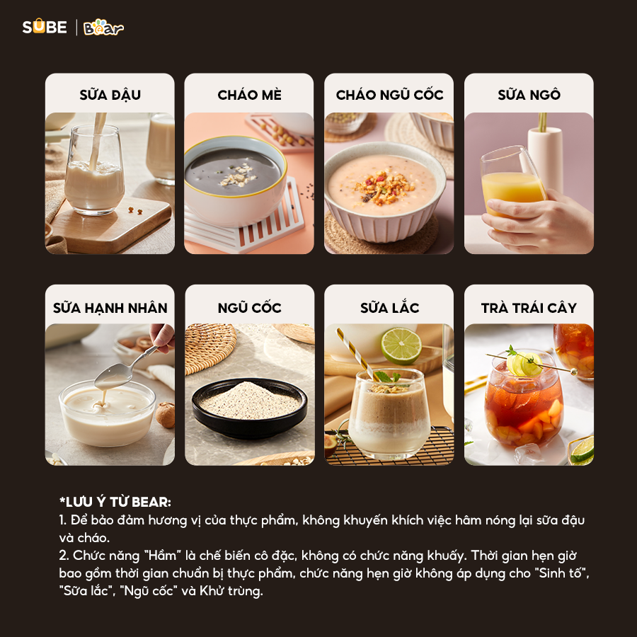 - Chức năng đa dạng: Khử trùng, Ngũ cốc, Hầm, Sữa lắc, Sinh tố, Sữa hạt, Sữa ngô, Cháo ngũ cốc, Nấu thuốc, Sữa đậu nành,....